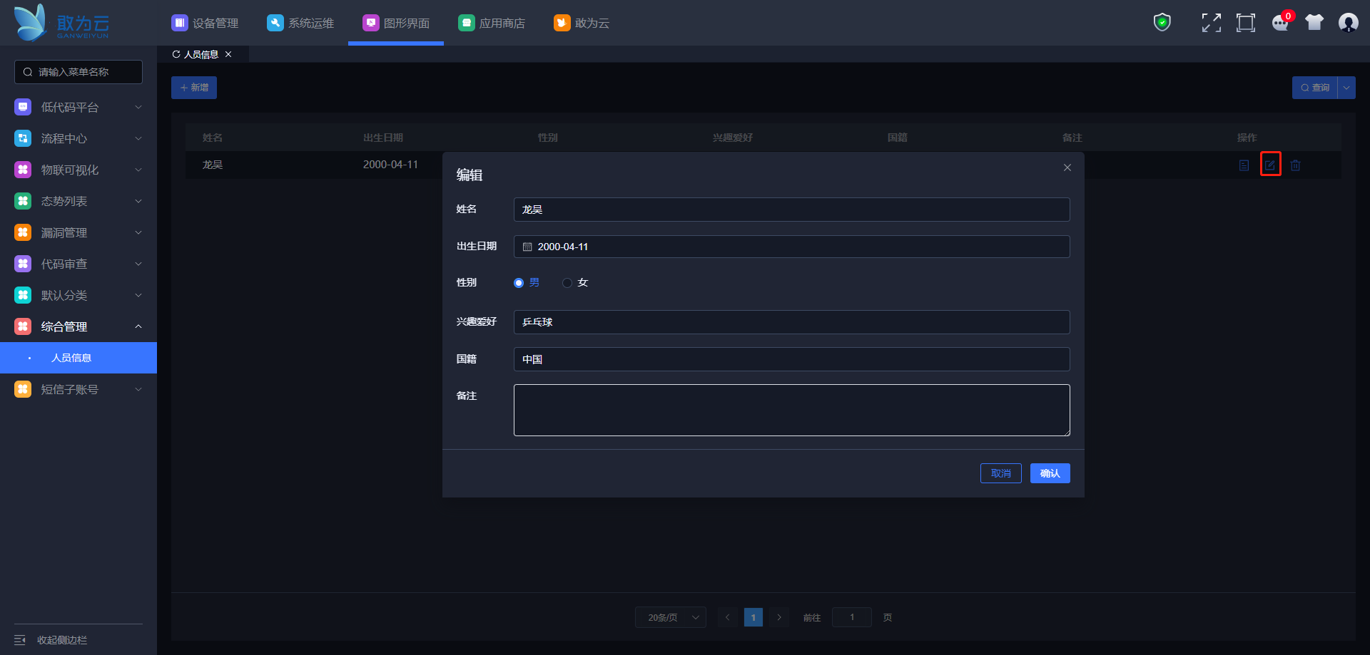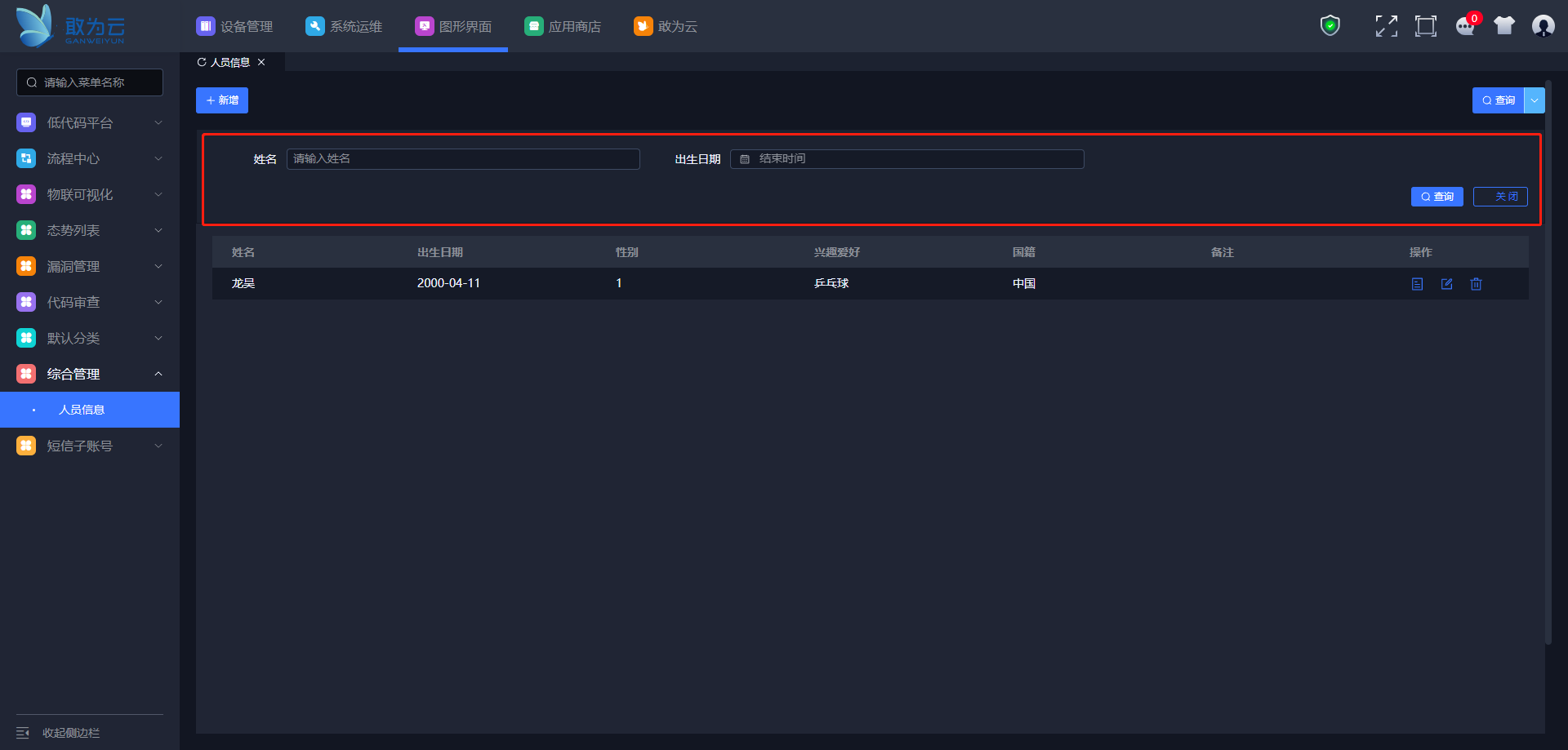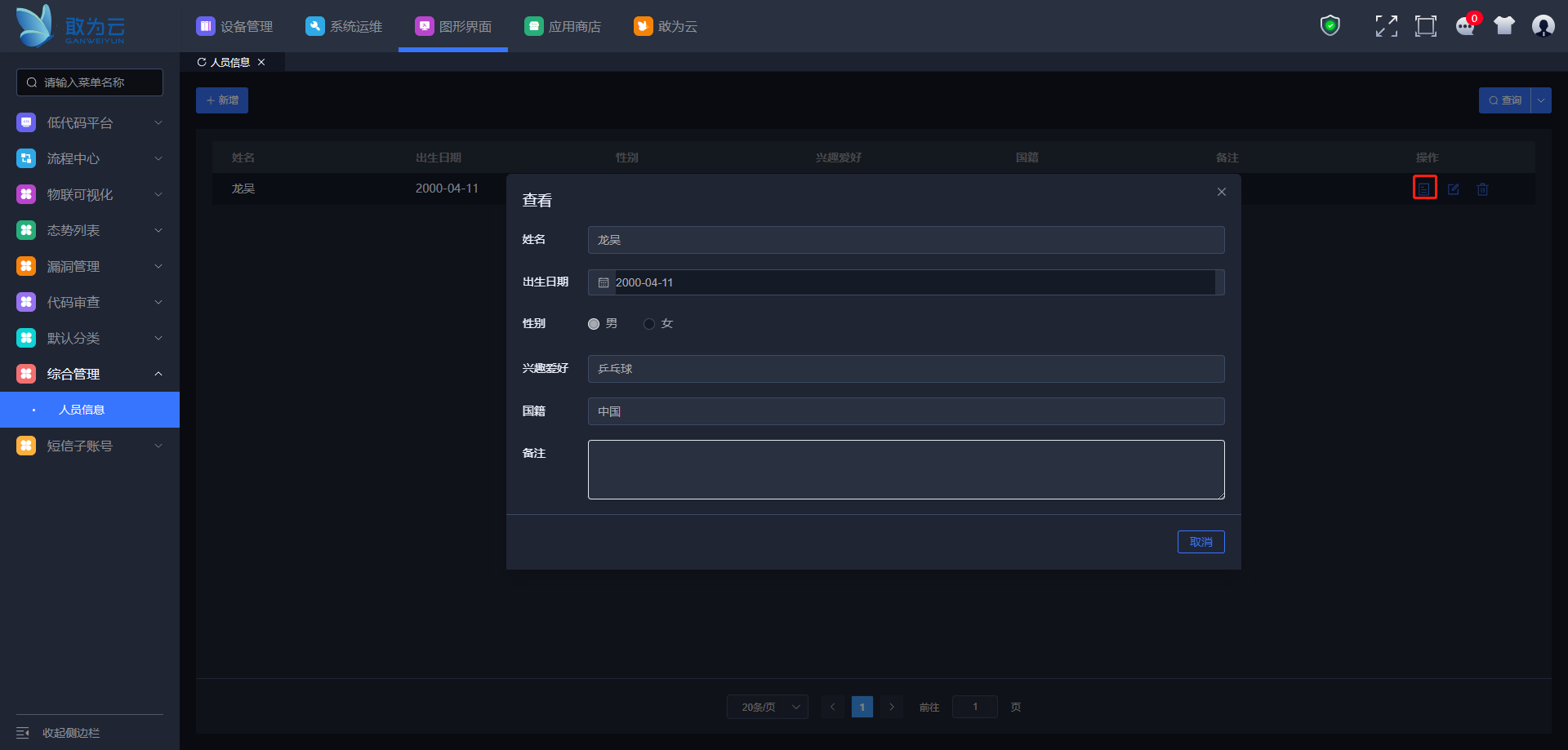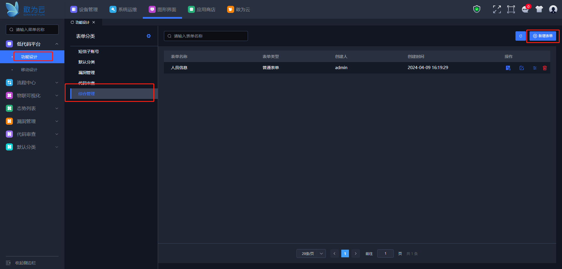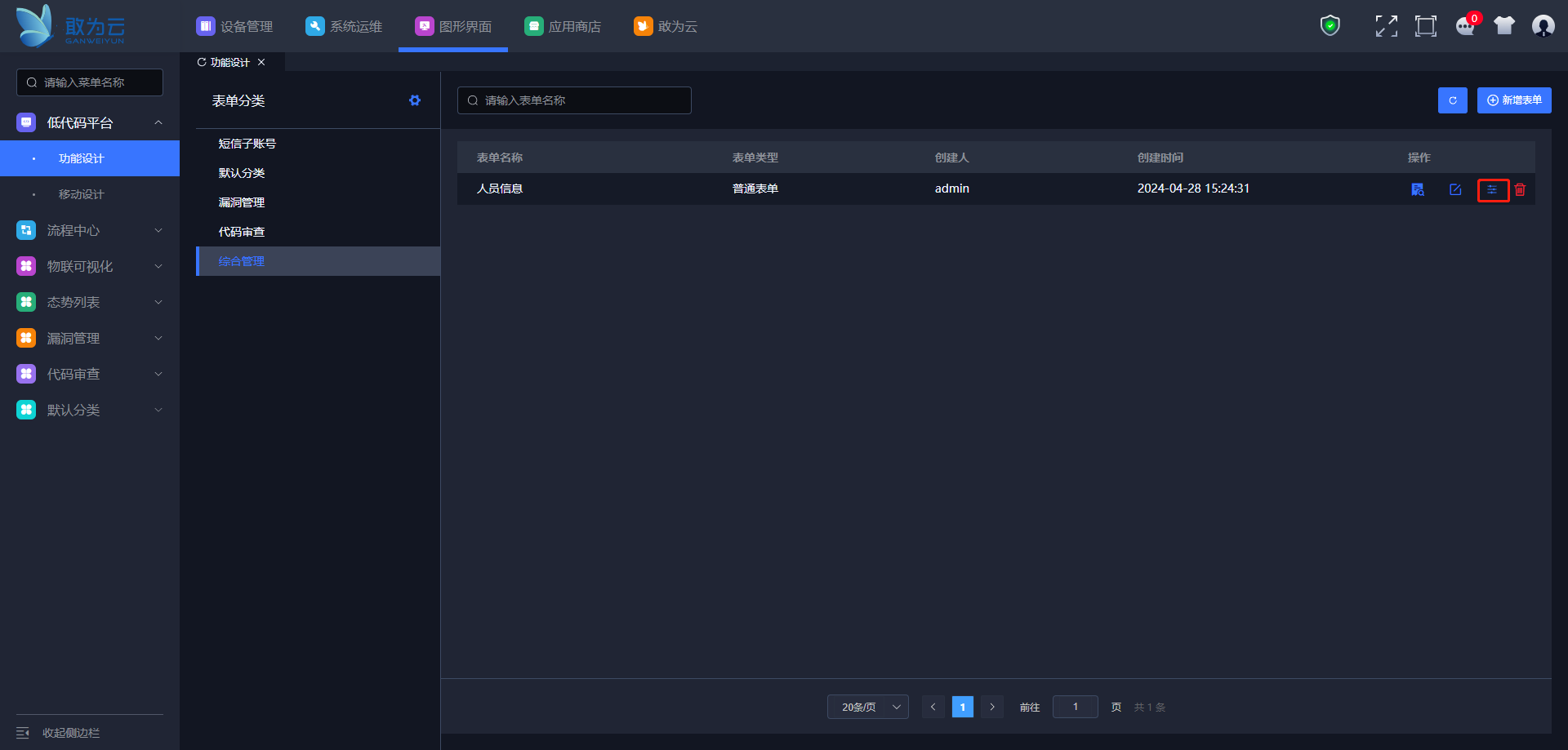 在新增的菜单界面可以对配置的表单进行增删改查操作。