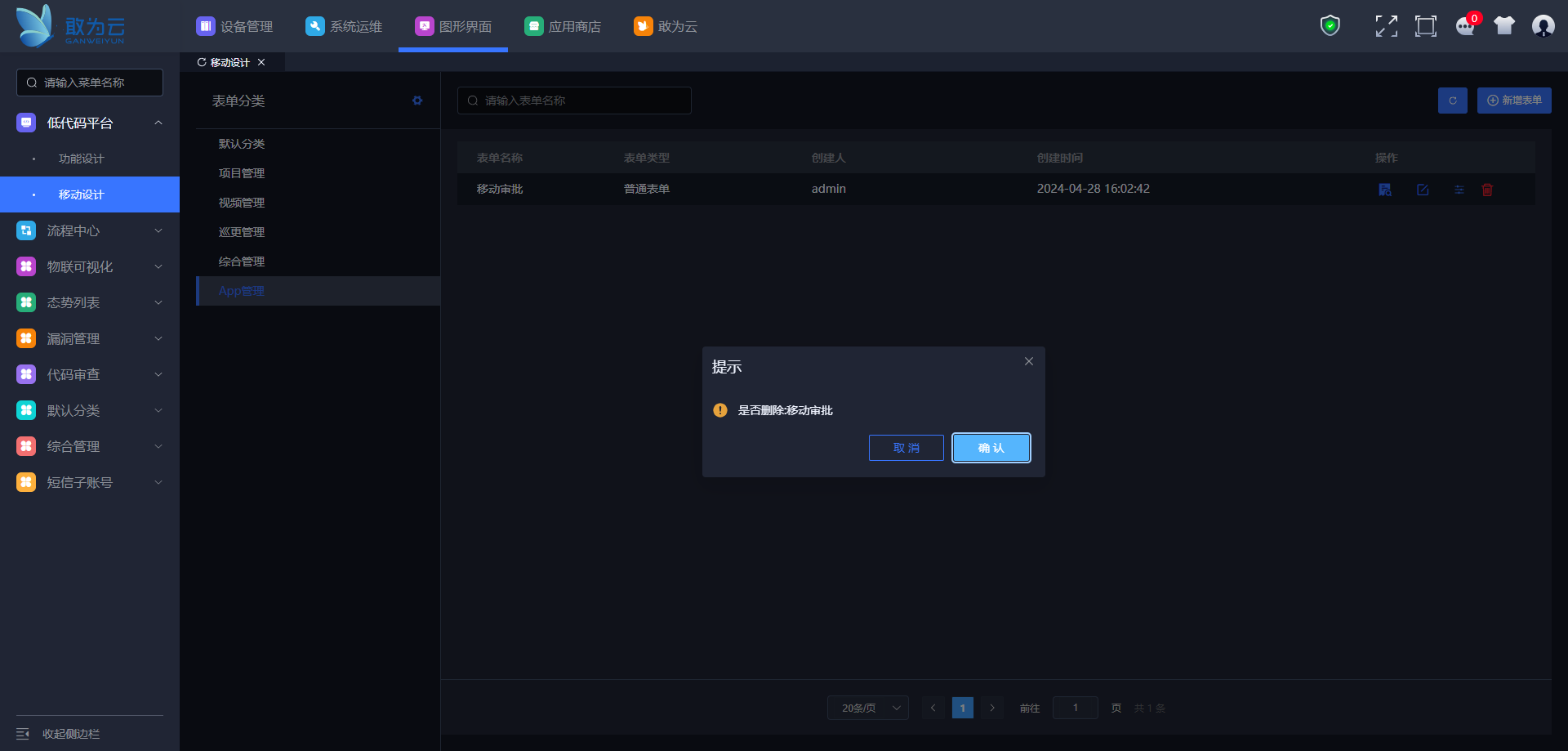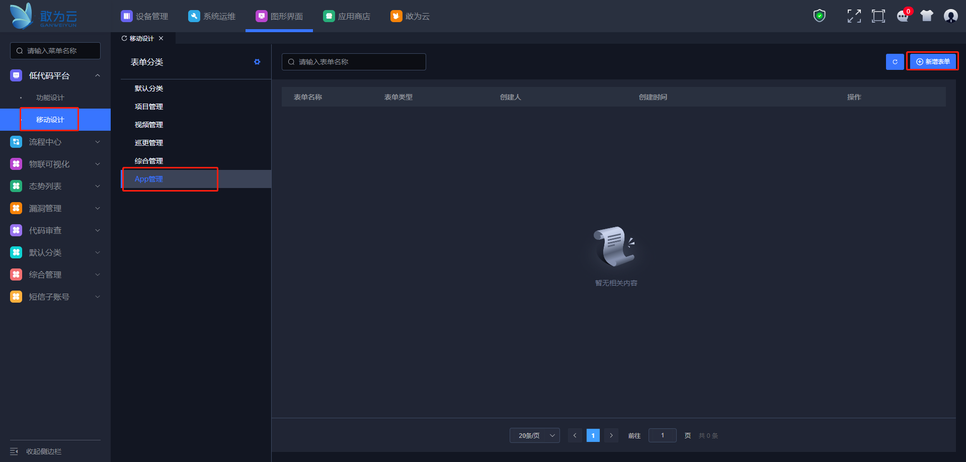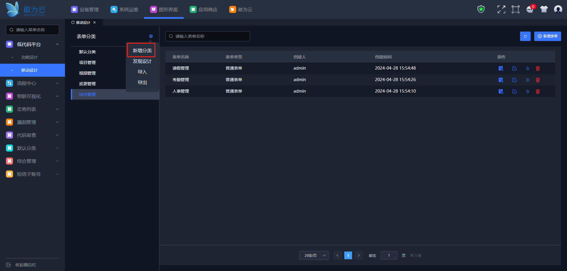 | 2 | 移动设计 | 支持移动端表单和表单分类的新增、删除、修改、查询操作,菜单页面生成 |