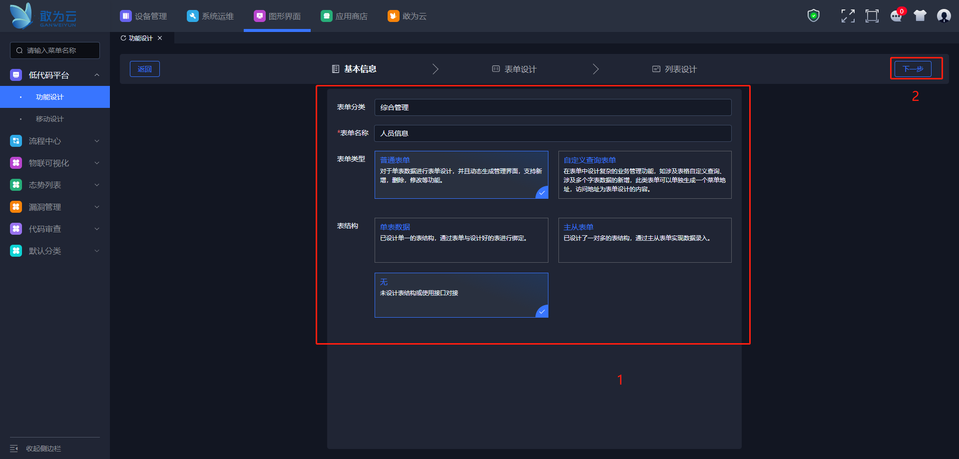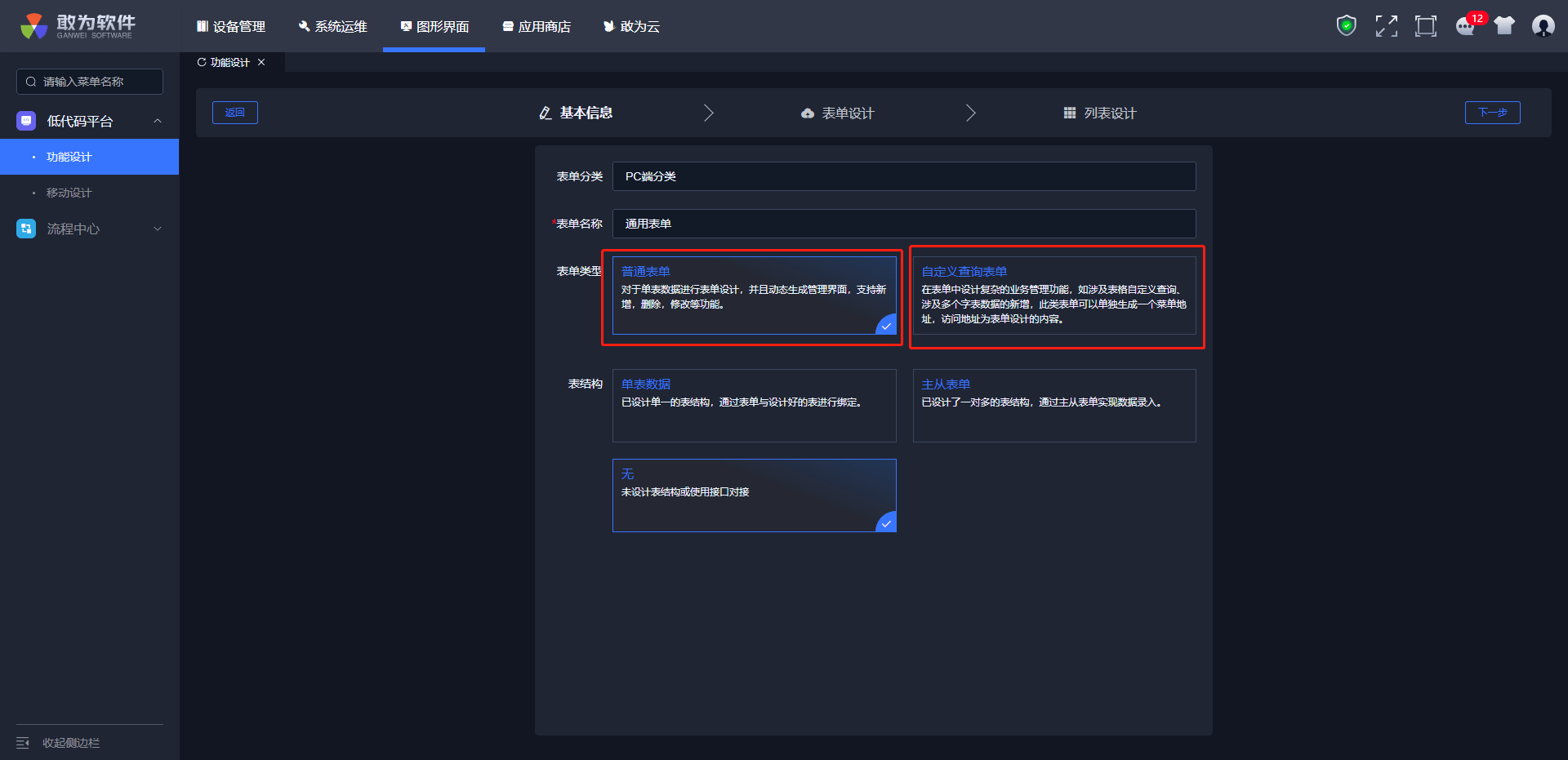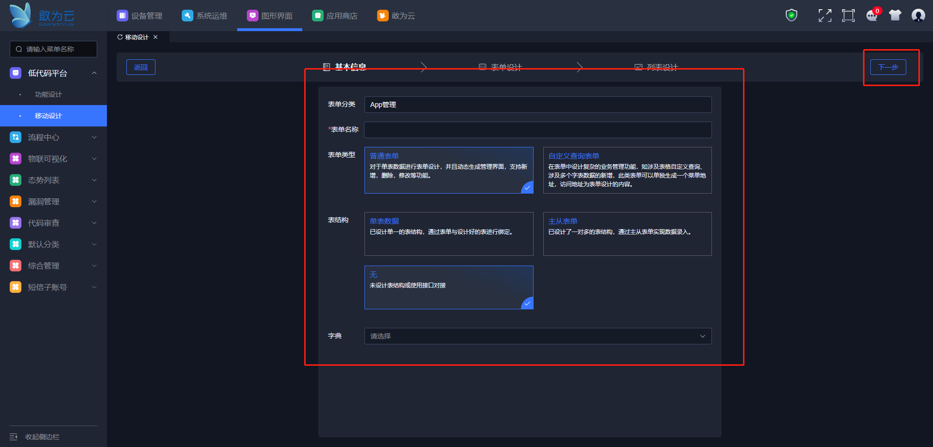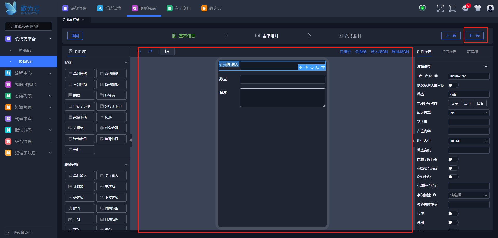 左边为组件库,可以自定义表单样式,自定义组件完成后有点击“下一步”。