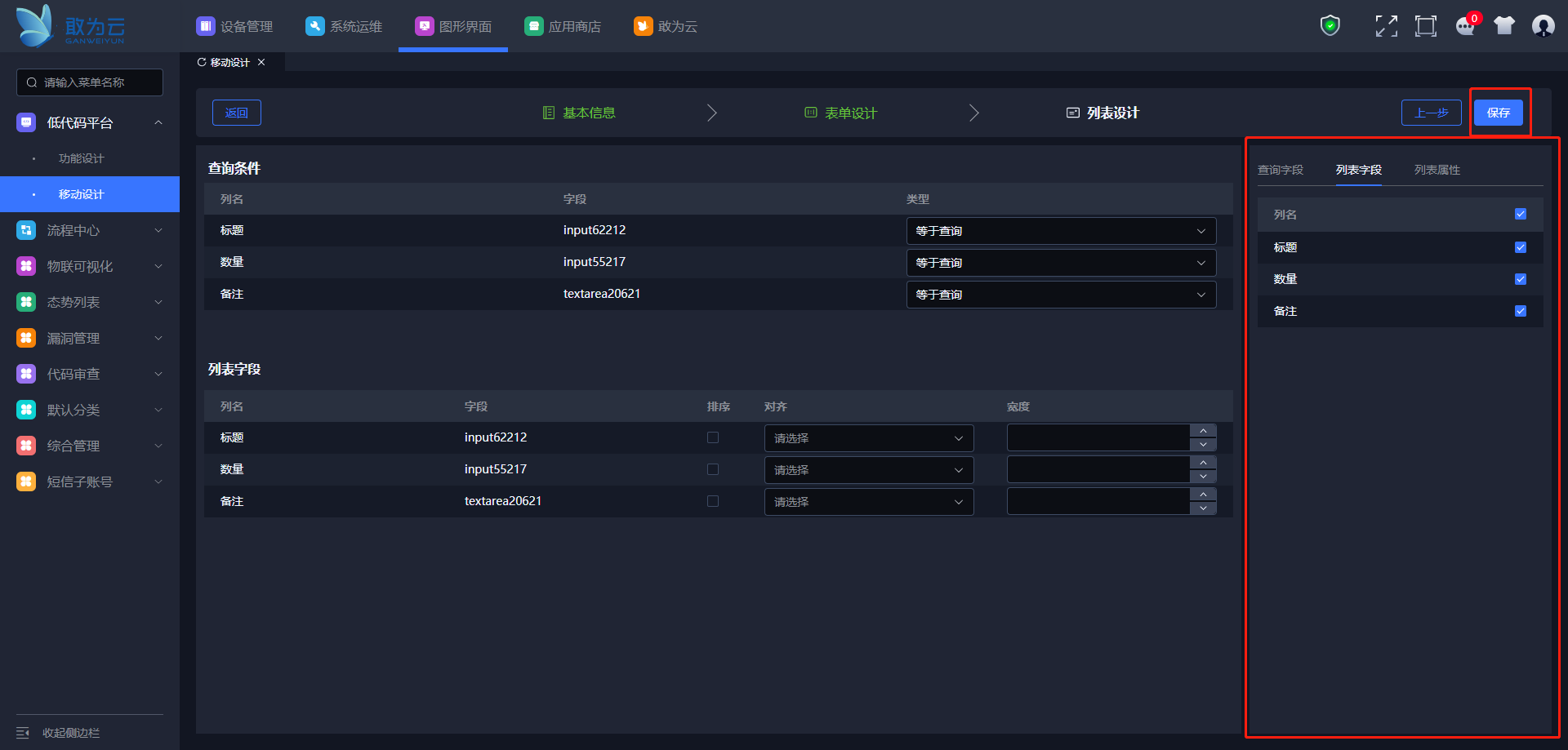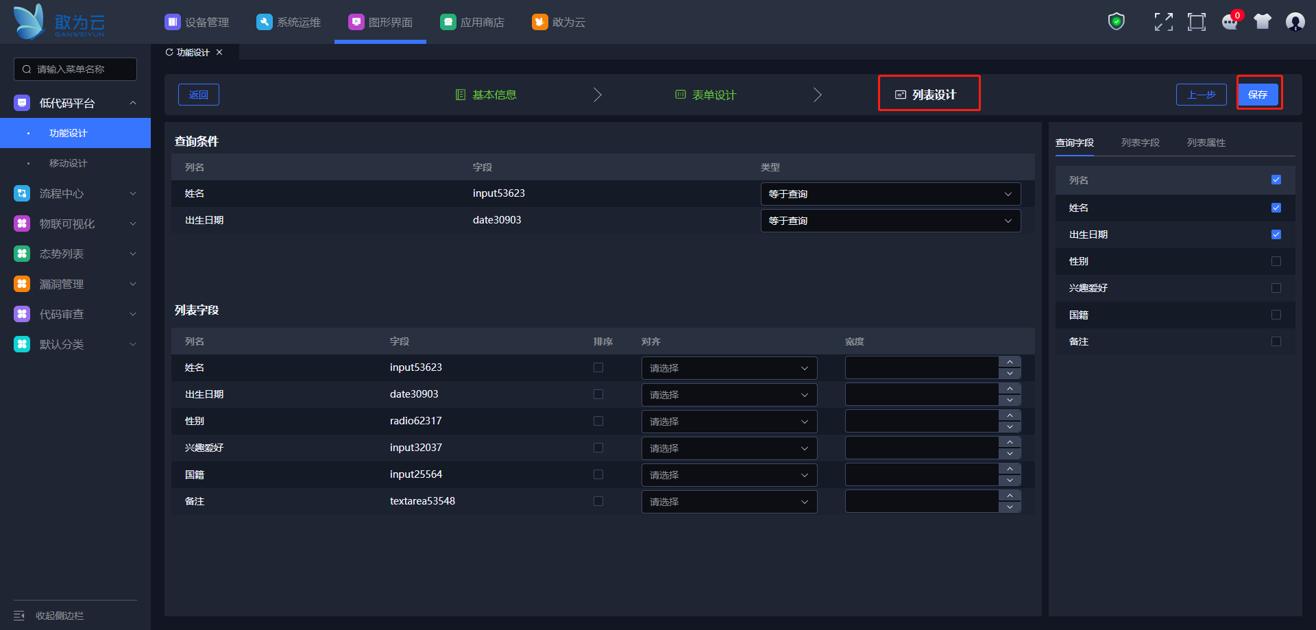 在列表设计界面中可以配置查询条件以及查询列表可显示的列名、列表属性等配置项均可自定义,配置完成后点击保存即可。