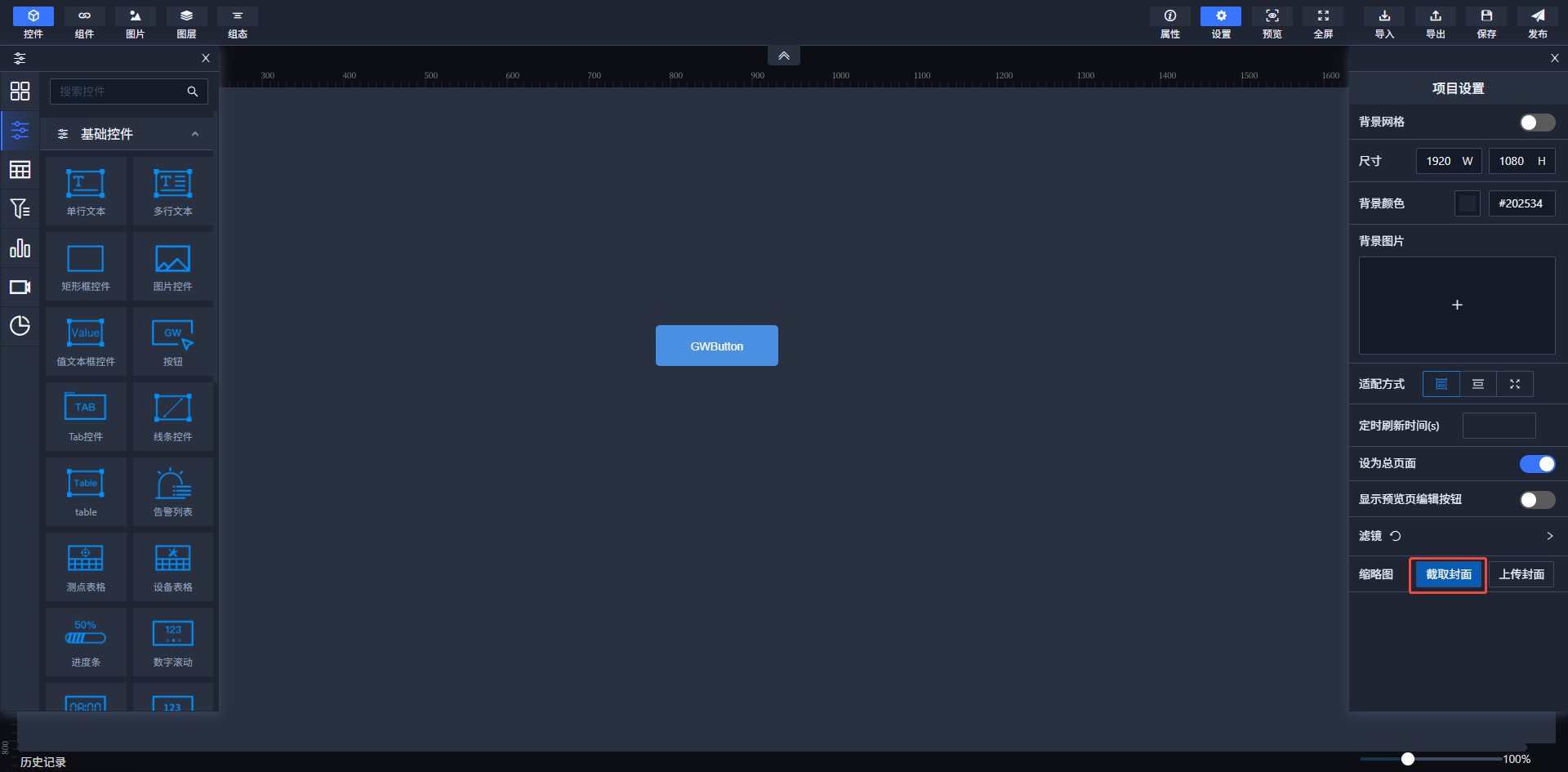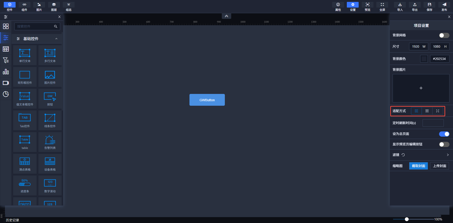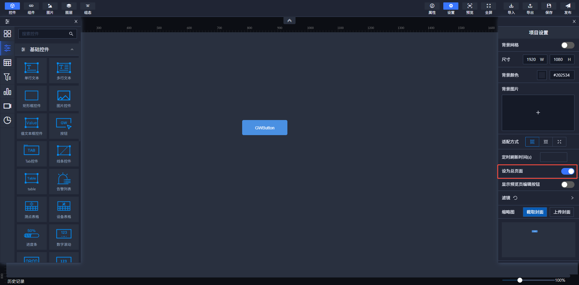在编辑页面顶部导航栏设置区域中,点击画布出现属性配置区域,存在设为总页面配置项。当开关打开时,该页面作为这个项目中的总页面,在项目列表页面点击查看打开的就是设为总页面的态势页面(项目列表中该项目的封面也采用的是设为总页面态势的封面)。
