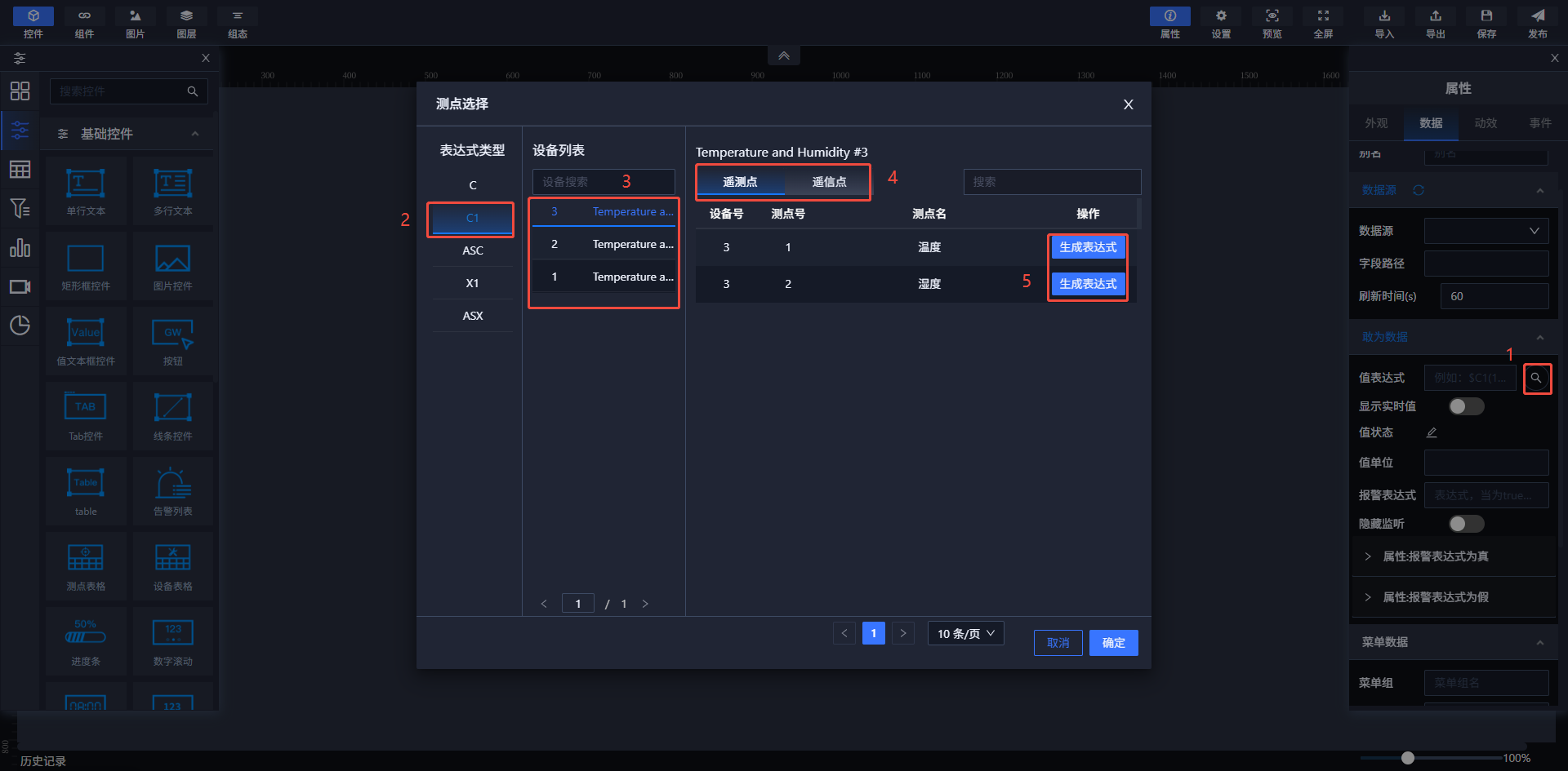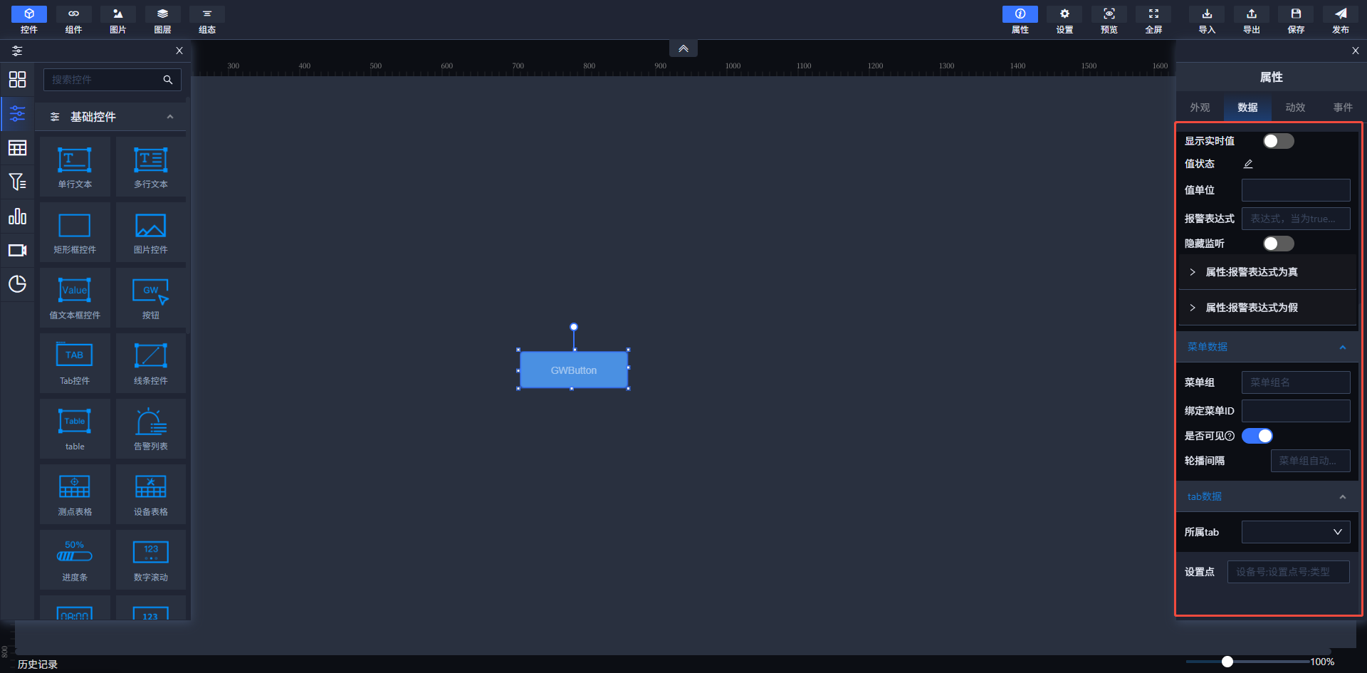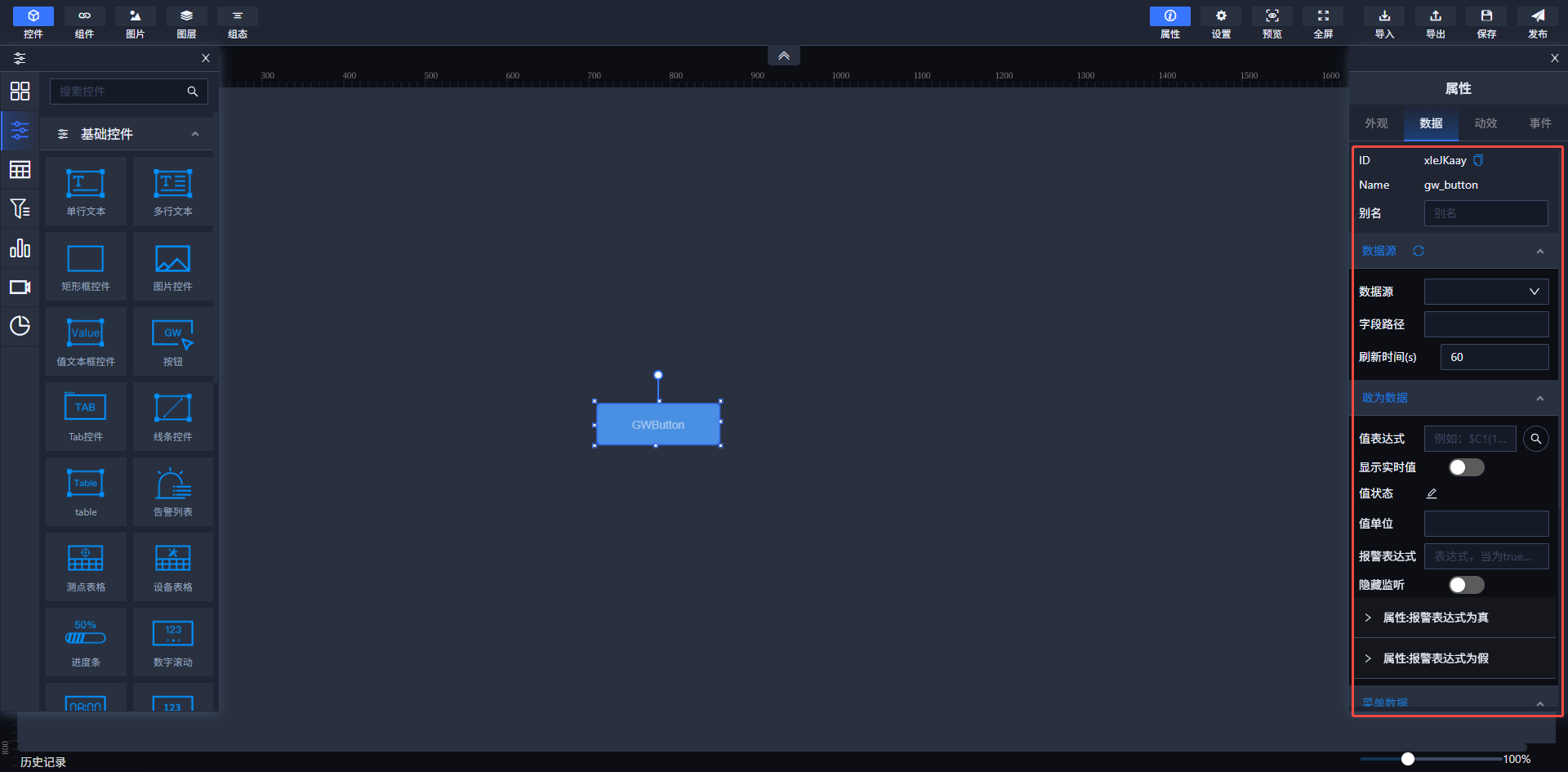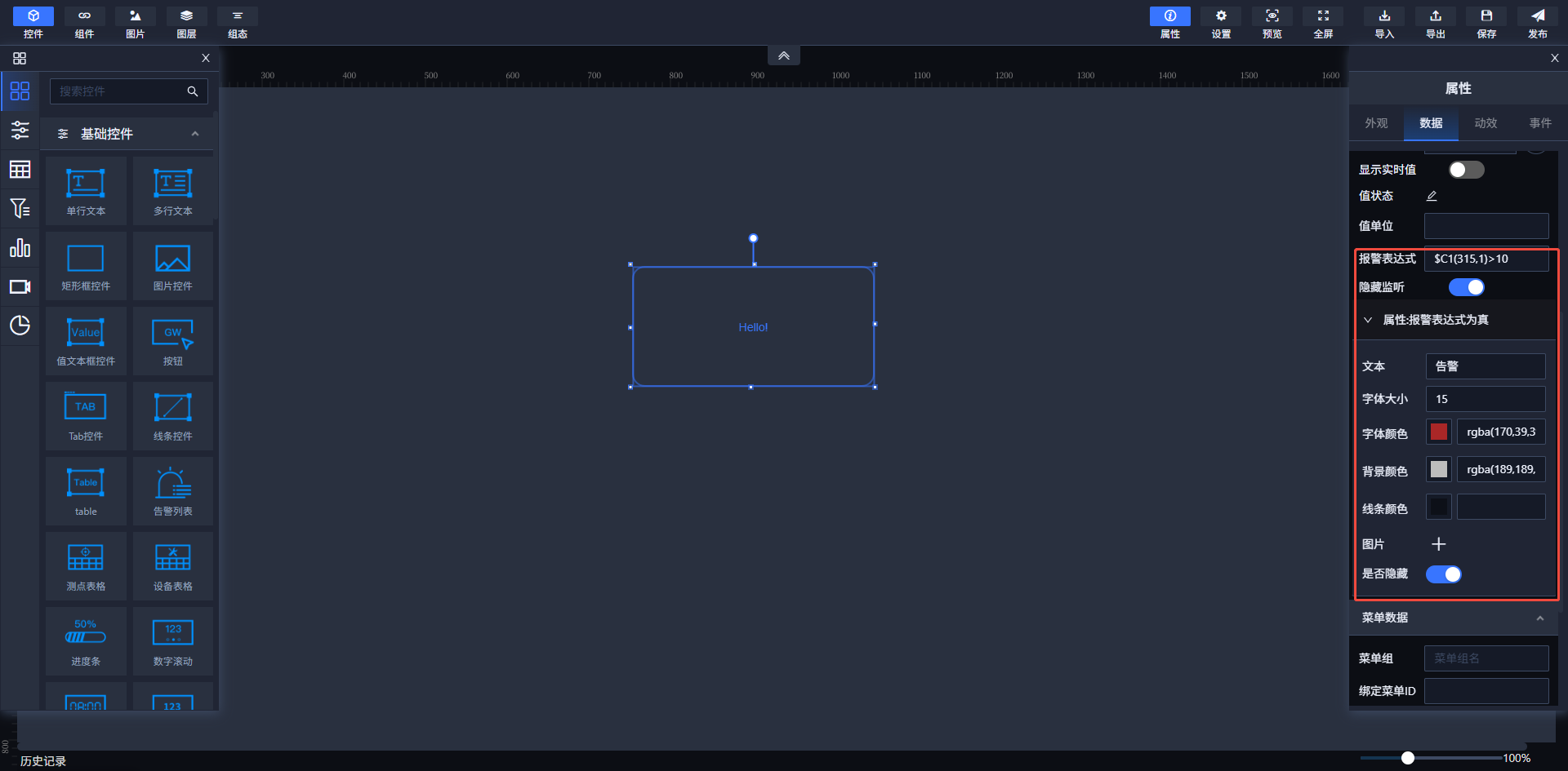 部分支持此功能的组件在这一模块可以设置值表达式、值转换、值单位和报警表达式等。当报警表达式为真时,可以设置控件属性样式;而当报警表达式为假时,可以设置跳转地址。