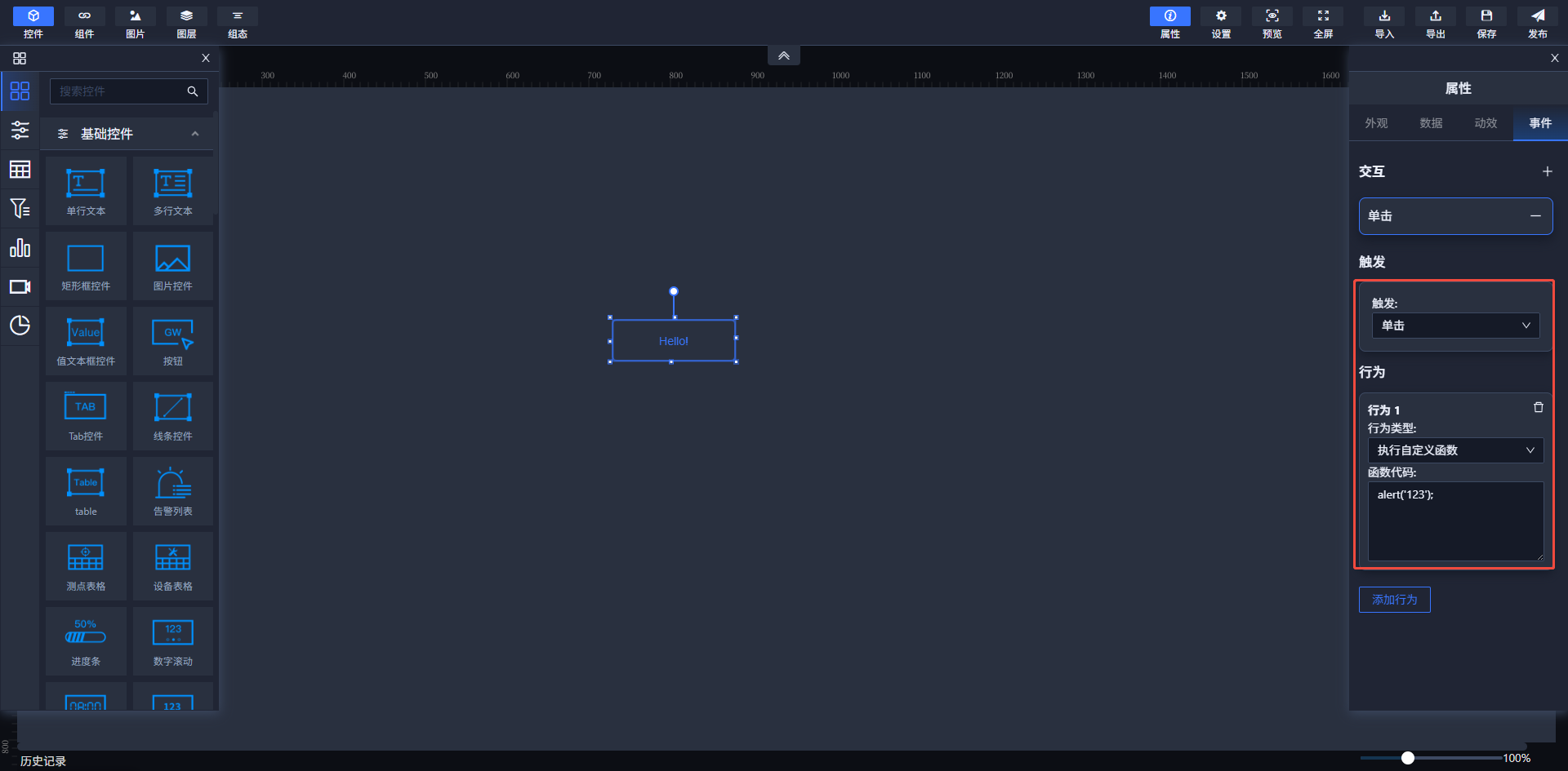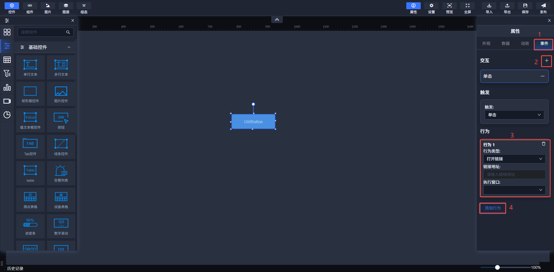在可视化软件中,部分控件支持事件功能。即,可以为支持时间功能的控件设置鼠标单击或双击事件。