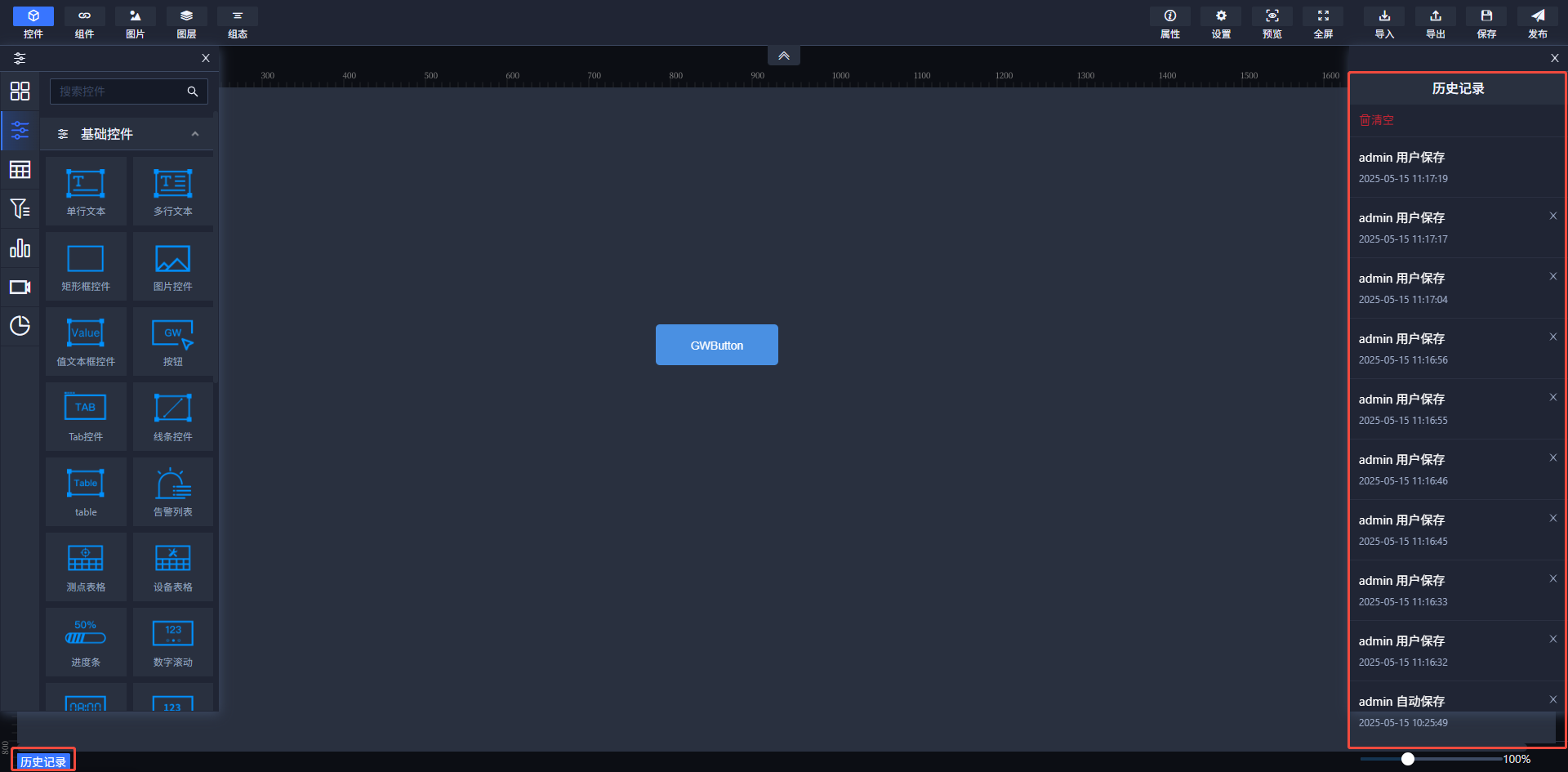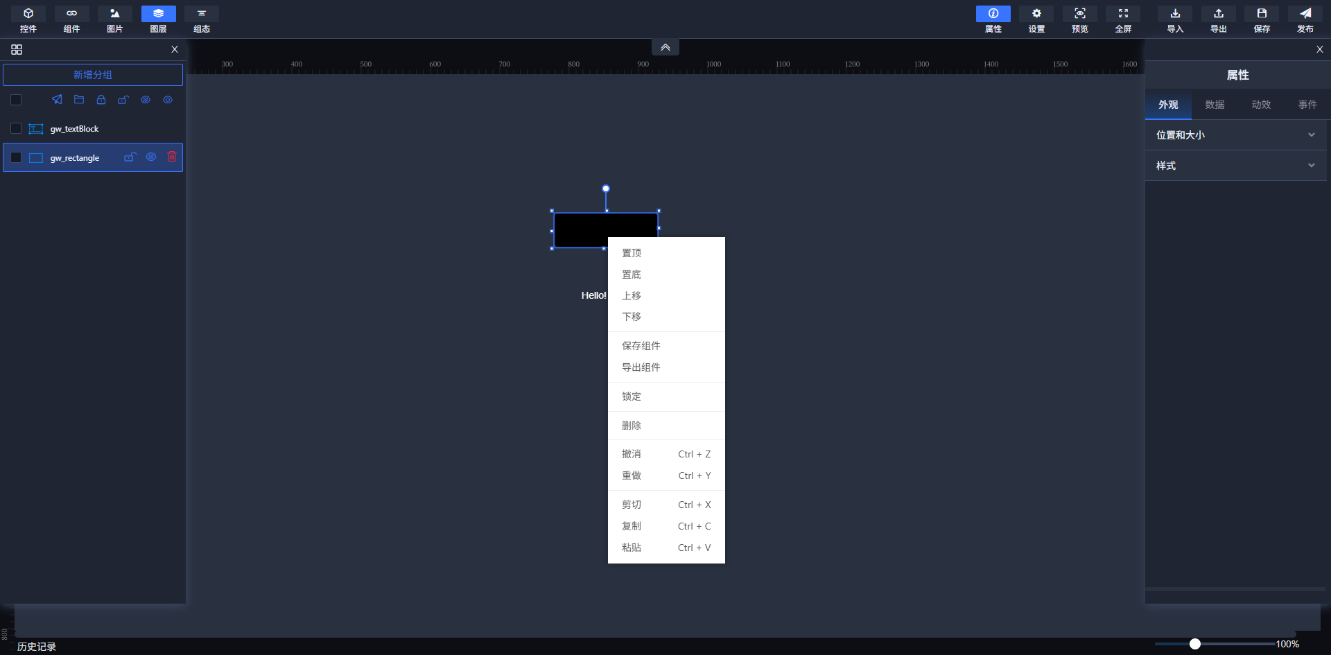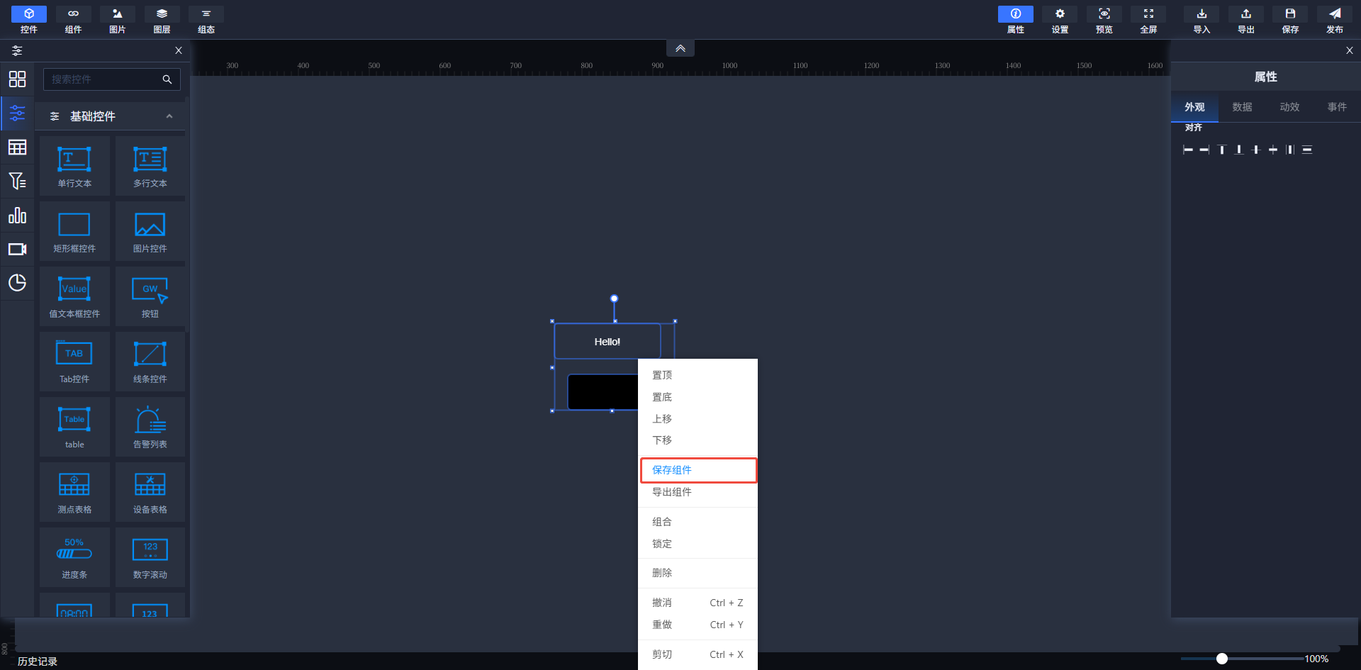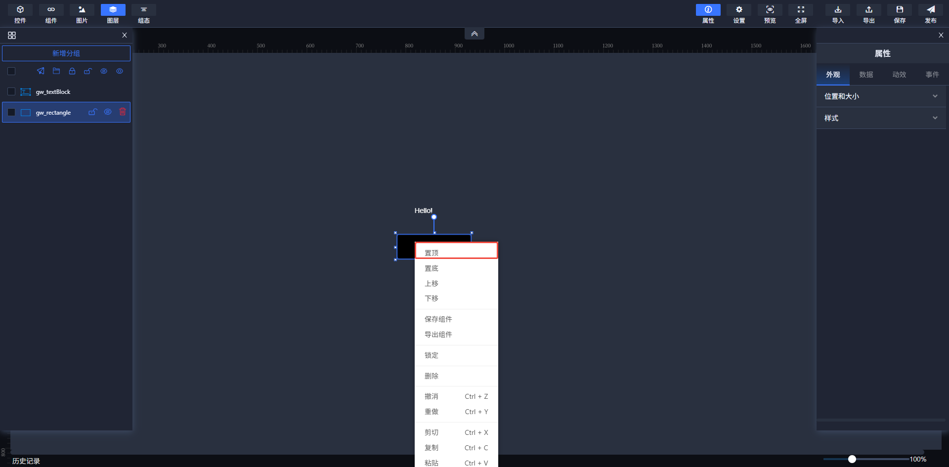 为了方便用户对控件进行调整,选中组件右击点击置顶功能,可调整该控件的图层层级,使该控件置于最顶层;置底置于最底层。