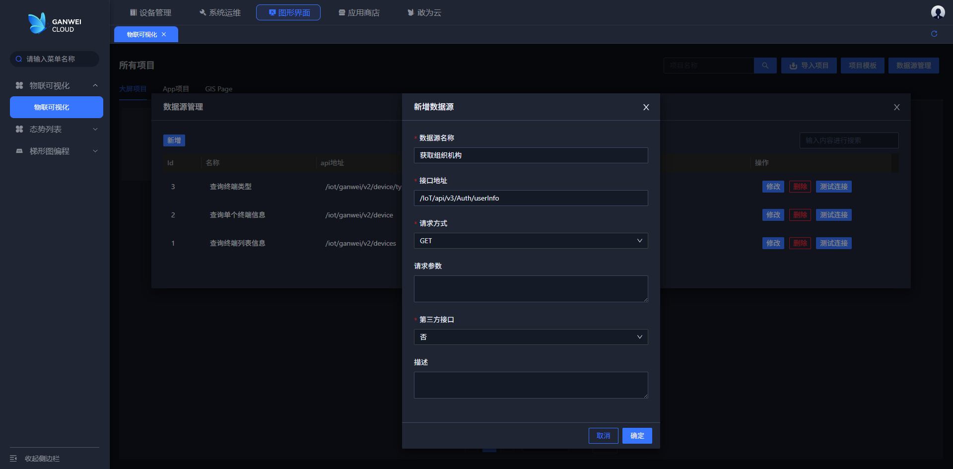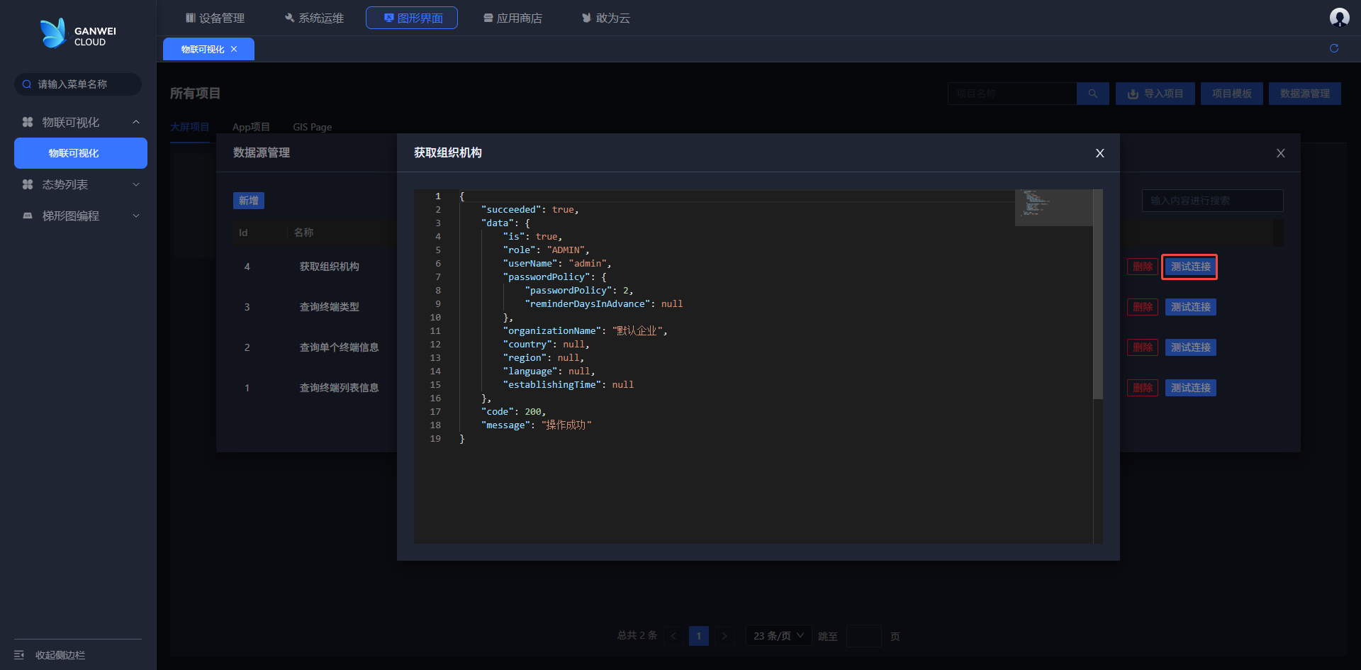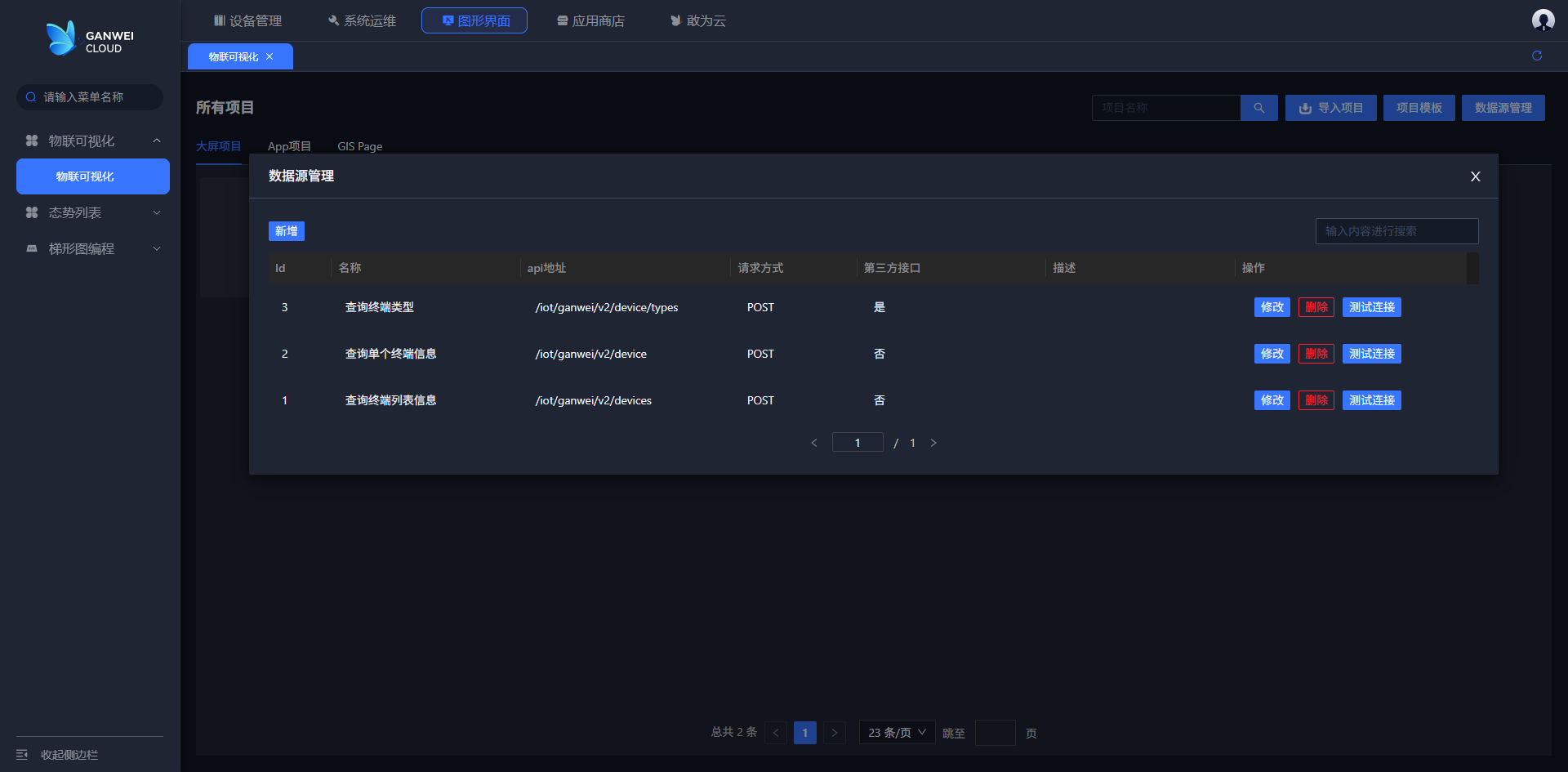 2.点击数据源出现数据源列表弹窗,可以对数据源进行新增,修改,删除和测试连接操作,如下图所示: