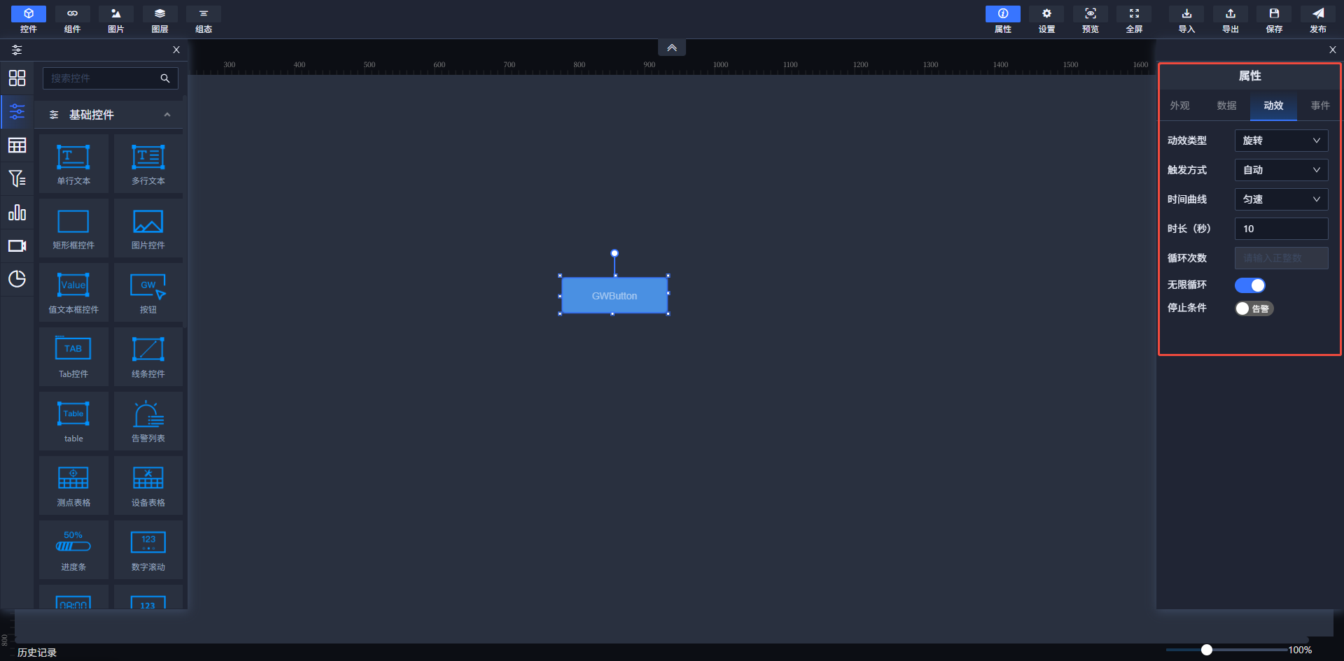 选中控件后,在右侧属性栏单击“动效”选项卡,选择“旋转”特效,,然后依次设置触发方式、时间曲线、时长、循环次数或者开启无线循环属性后,单击保存按钮。然后在查看页面即可看到动画效果,如下图所示。