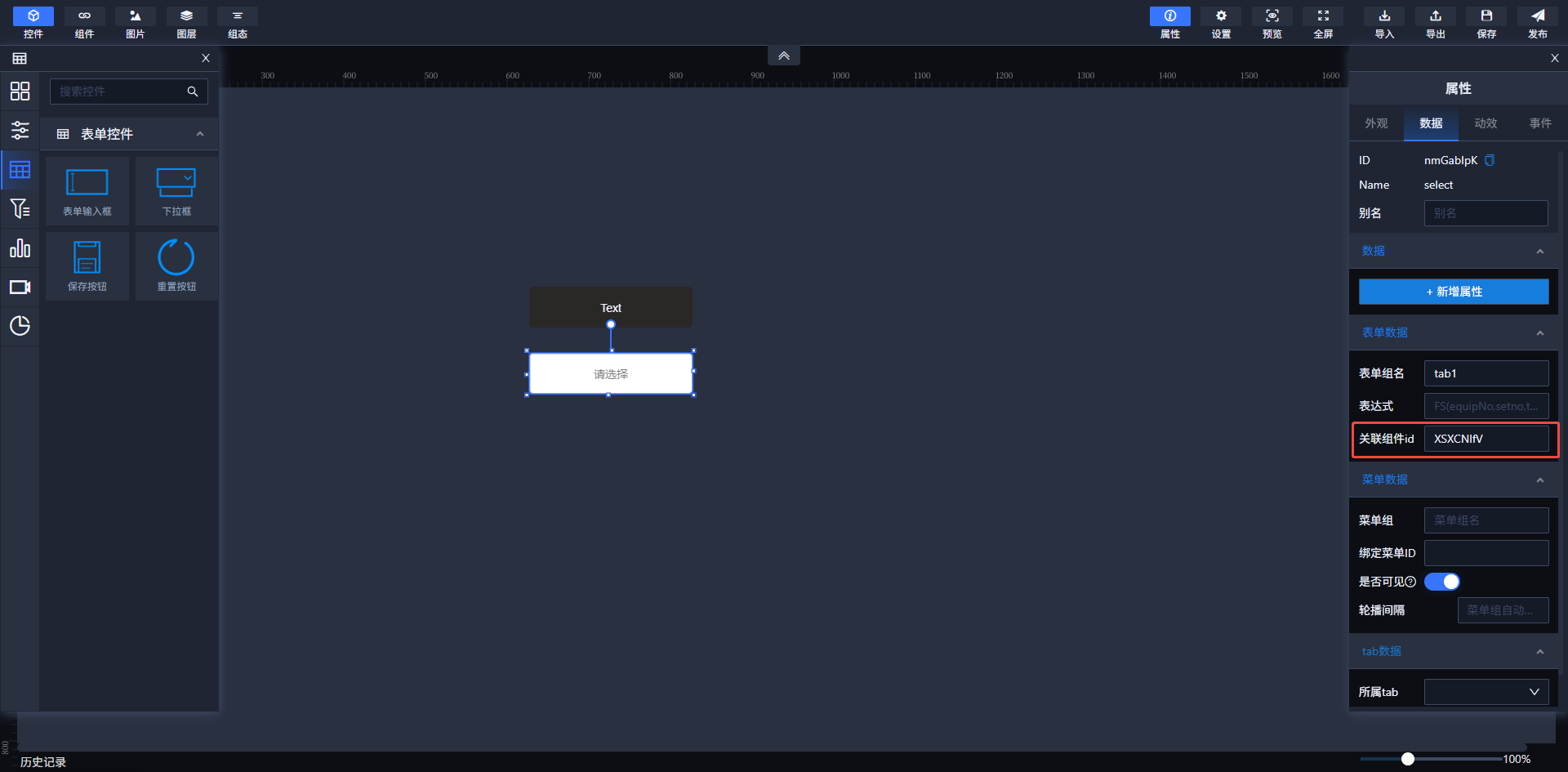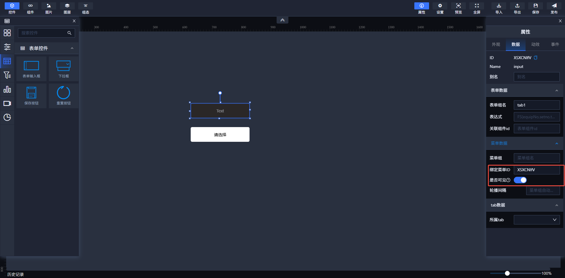 选择需要点击开启菜单功能的控件控制显示或隐藏的控件,将其绑定菜单ID的值选为点击控制显示隐藏的控件的ID。