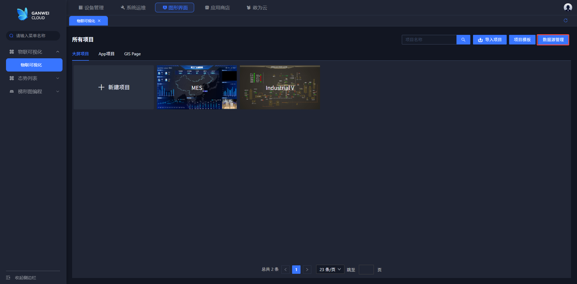 1.在项目列表页面顶部菜单栏中存在“数据源管理”按钮。