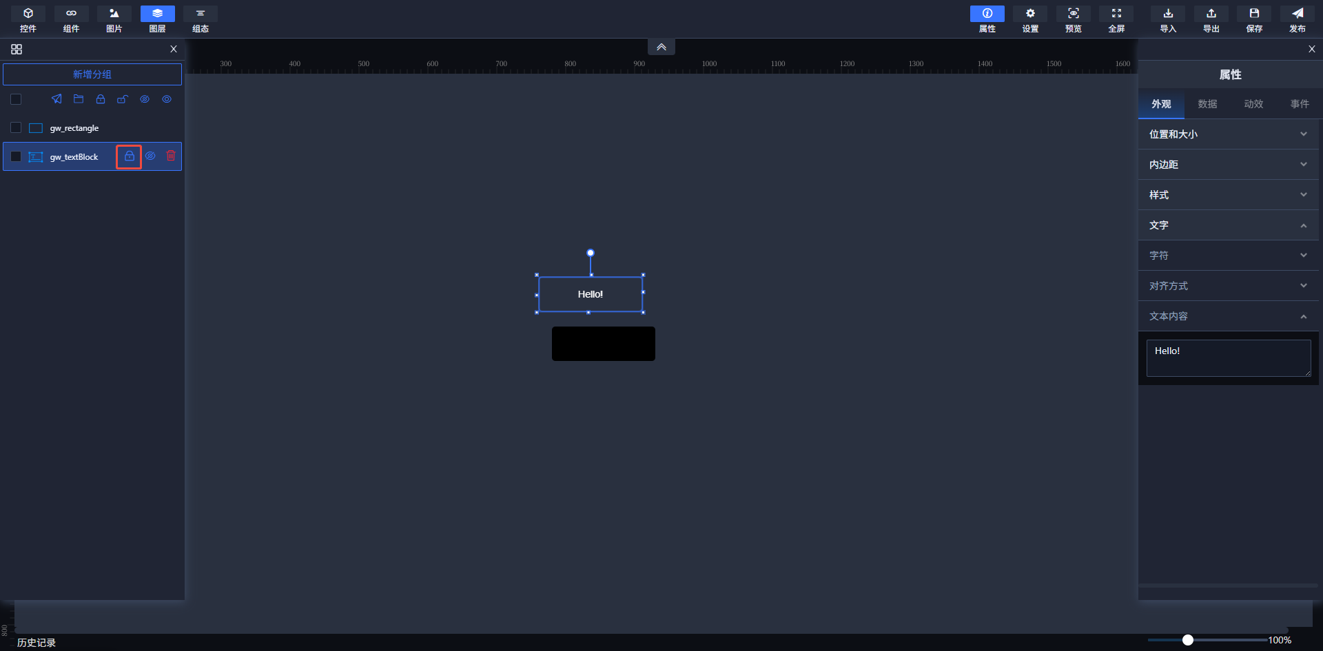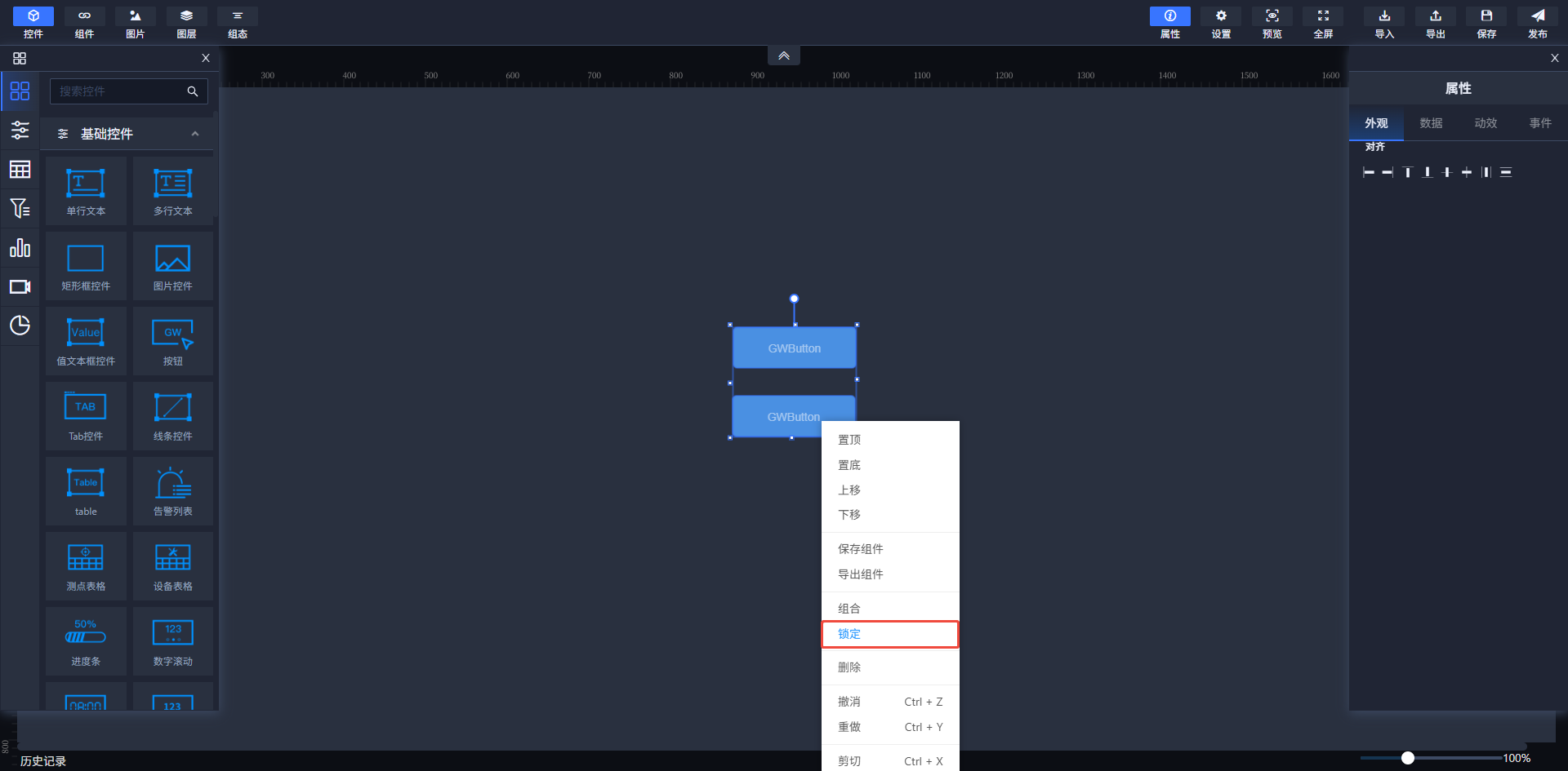 选中要锁定的控件,单击鼠标右键并选择"锁定"选项。控件被锁定后不可设置其他属性,不可拖动,不可选中。