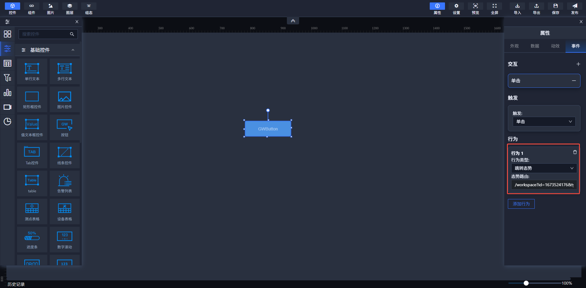 例如,选择“跳转态势”事件行为后,在“态势路由”中输入要打开的组态路由地址即可。保存后,在查看页面单击该控件,就会跳转到对应的组态页面。