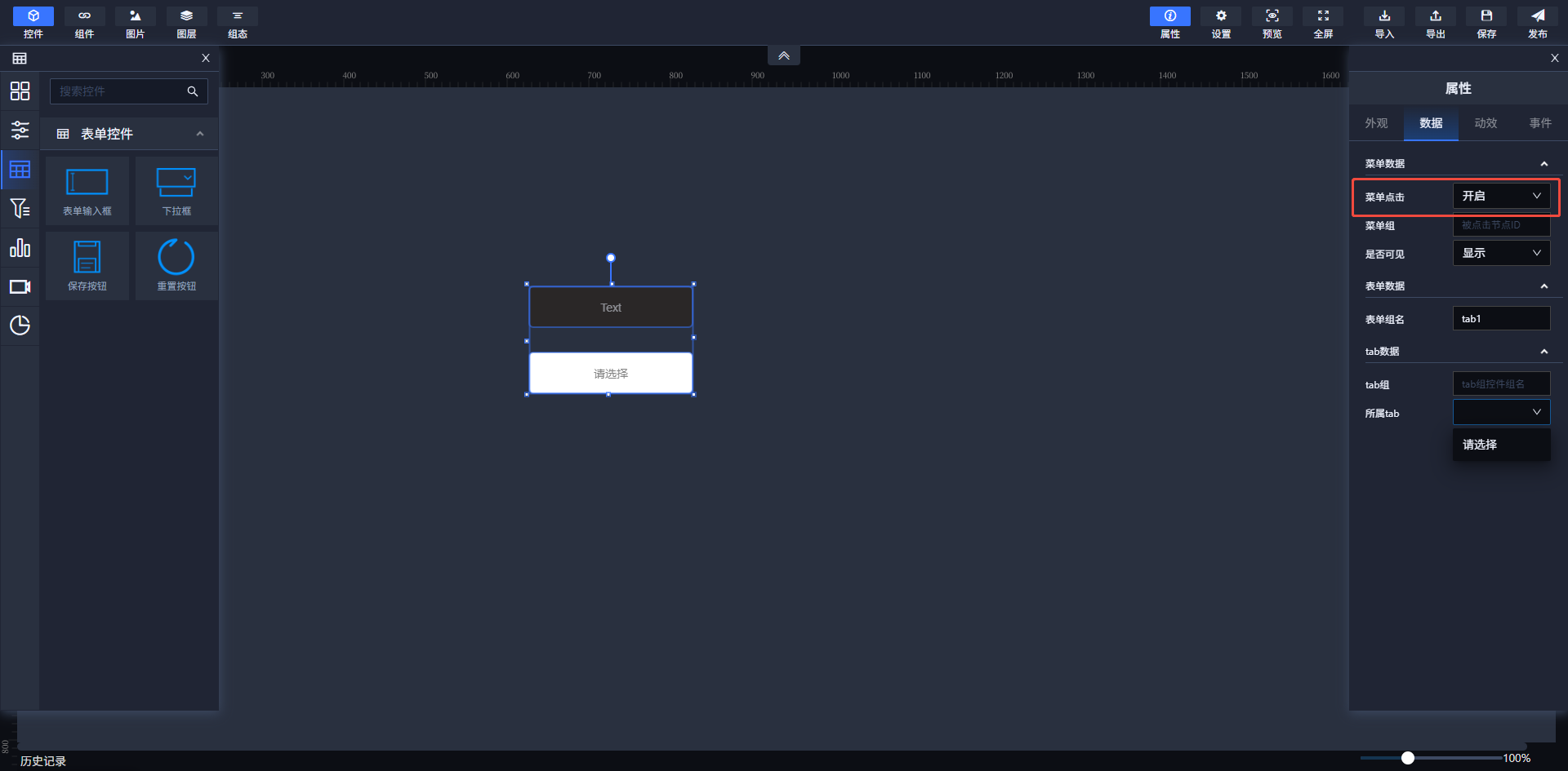 选择需要点击的控件,开启其"菜单点击"的功能。