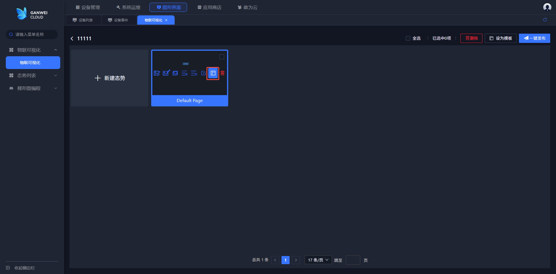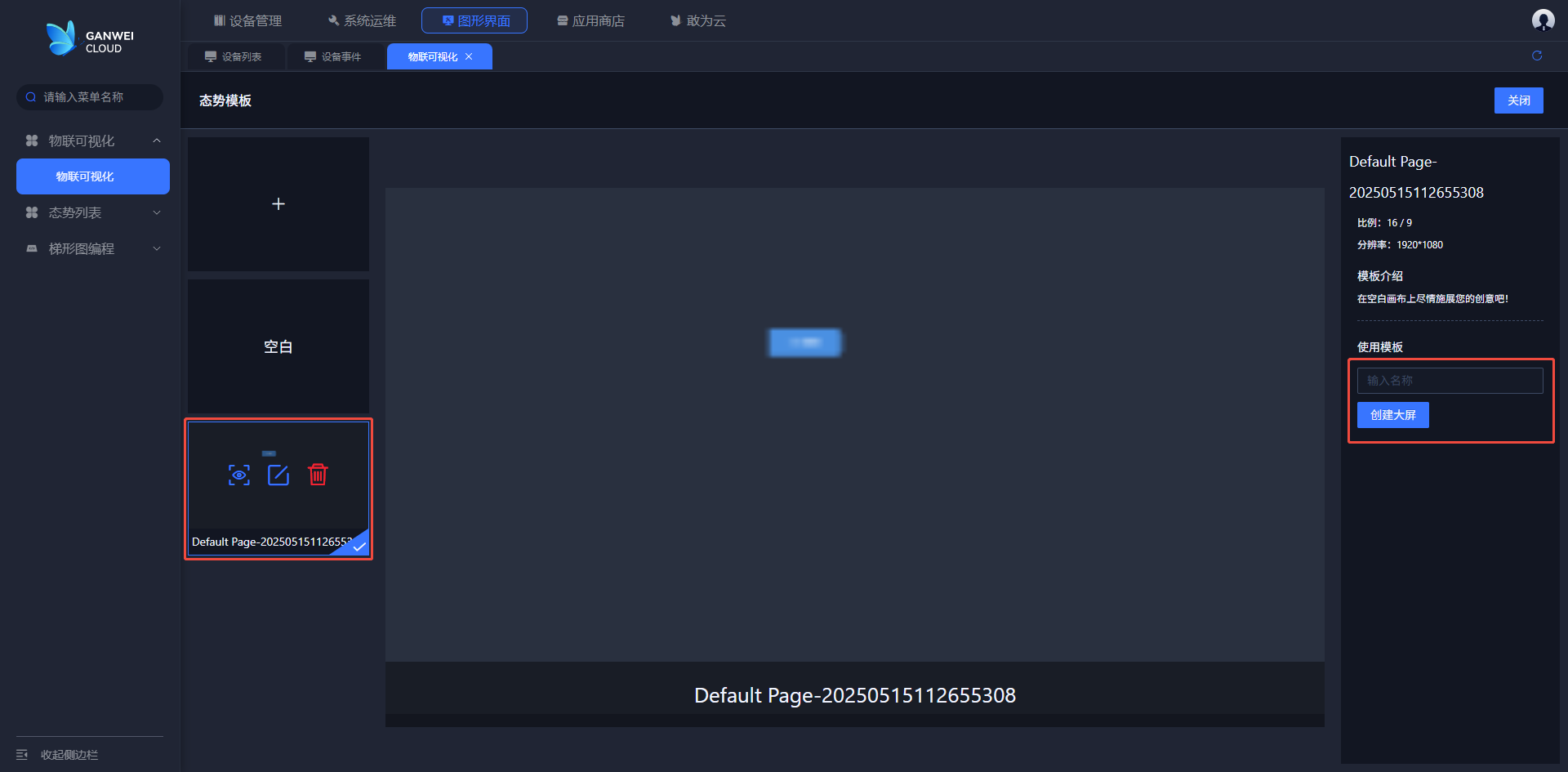在点击新建态势后,进入到态势模板选择页面(模板中有查看,编辑和删除操作);选中需要的模板创建大屏,新建的态势初始内容则是选中的模板的内容。