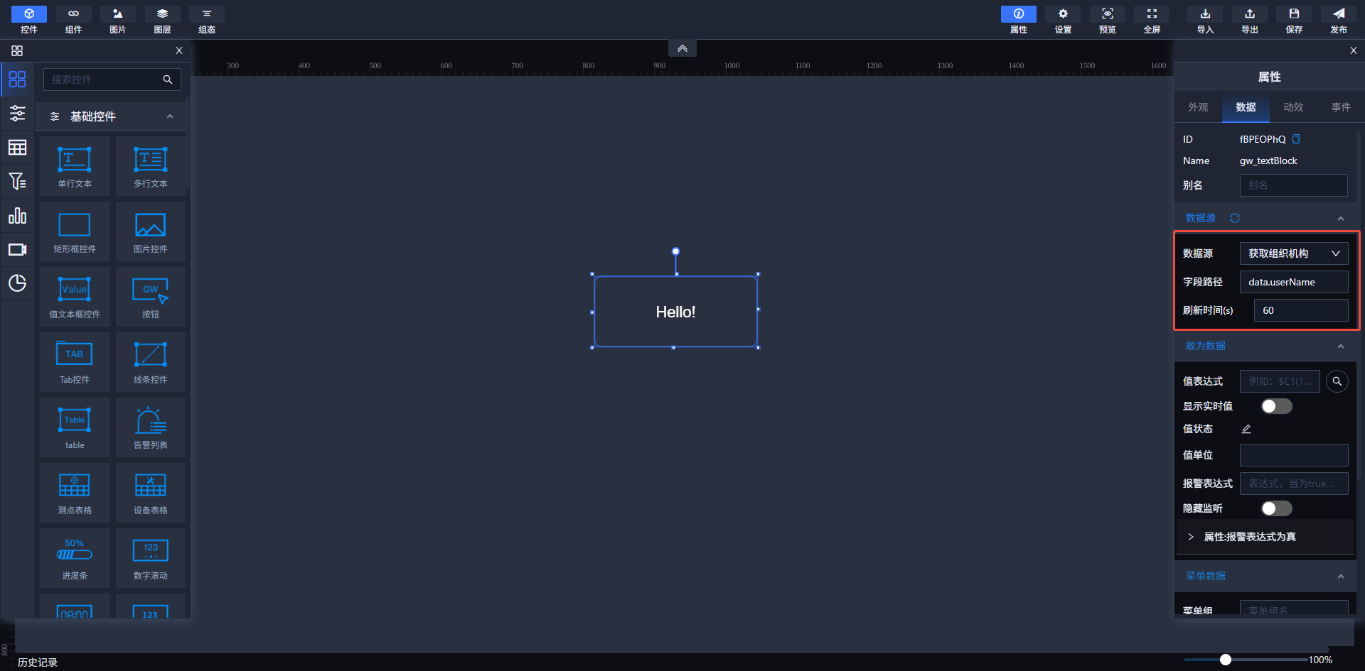4.添加好数据源并进行测试连接能获取数据之后,进入到态势编辑页面;将需要绑定数据源的控件拖入到画布中,在数据源区域选择需要绑定的数据源,同时绑定好数据源展示的数据路径及数据请求刷新时间,如下图: