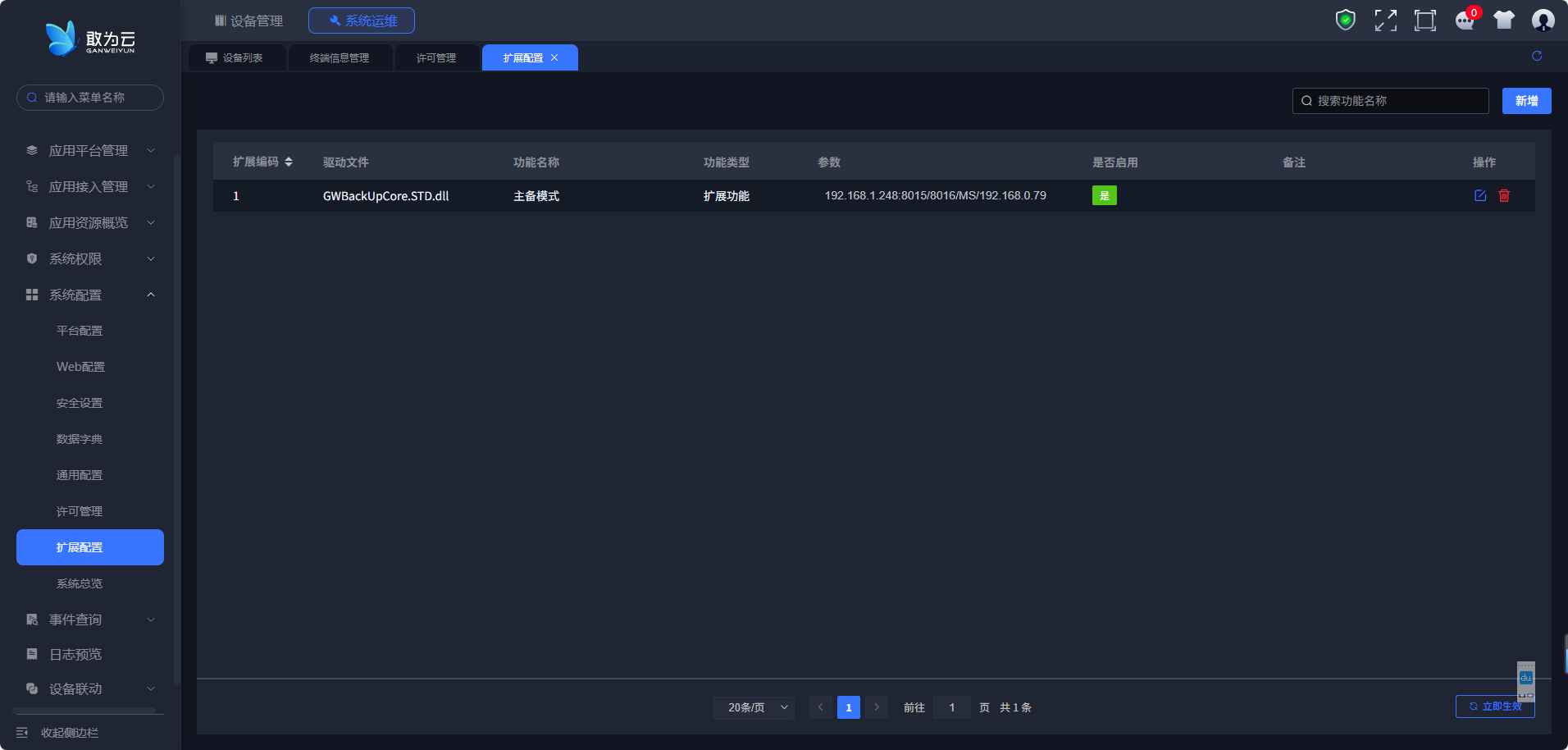 点击新增,功能类型选择扩展功能,输入其它相关配置信息。