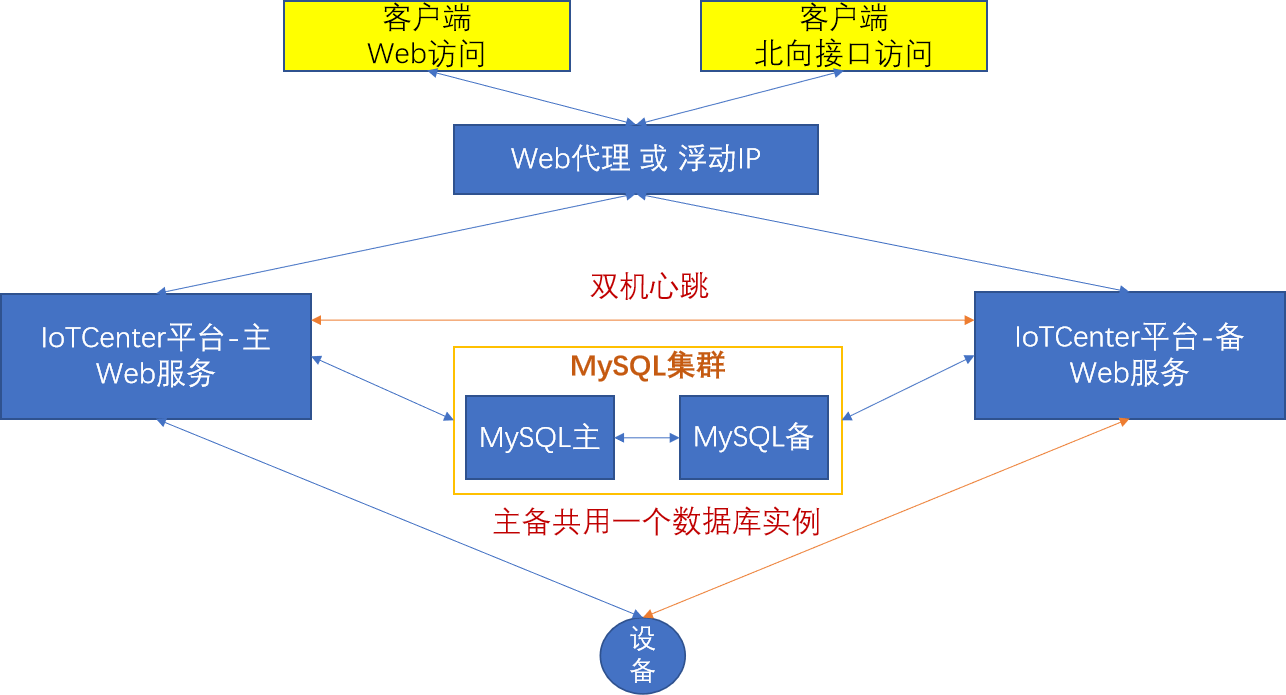 对于设备接入,在IoTCenter网关配置为热备的情况下,如果设备采用主动上报数据的方式接入IoTCenter的话,需要设备支持同时向主用和备用IoTCenter推送数据。否则,当IoTCenter主备切换时,将会出现一个服务器接收不到设备数据的情况。