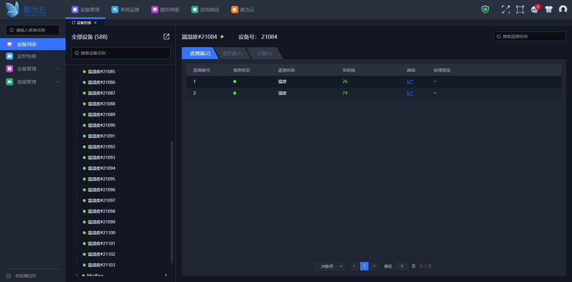 主服务器管理所有设备,设备状态显示为绿色,有数值。