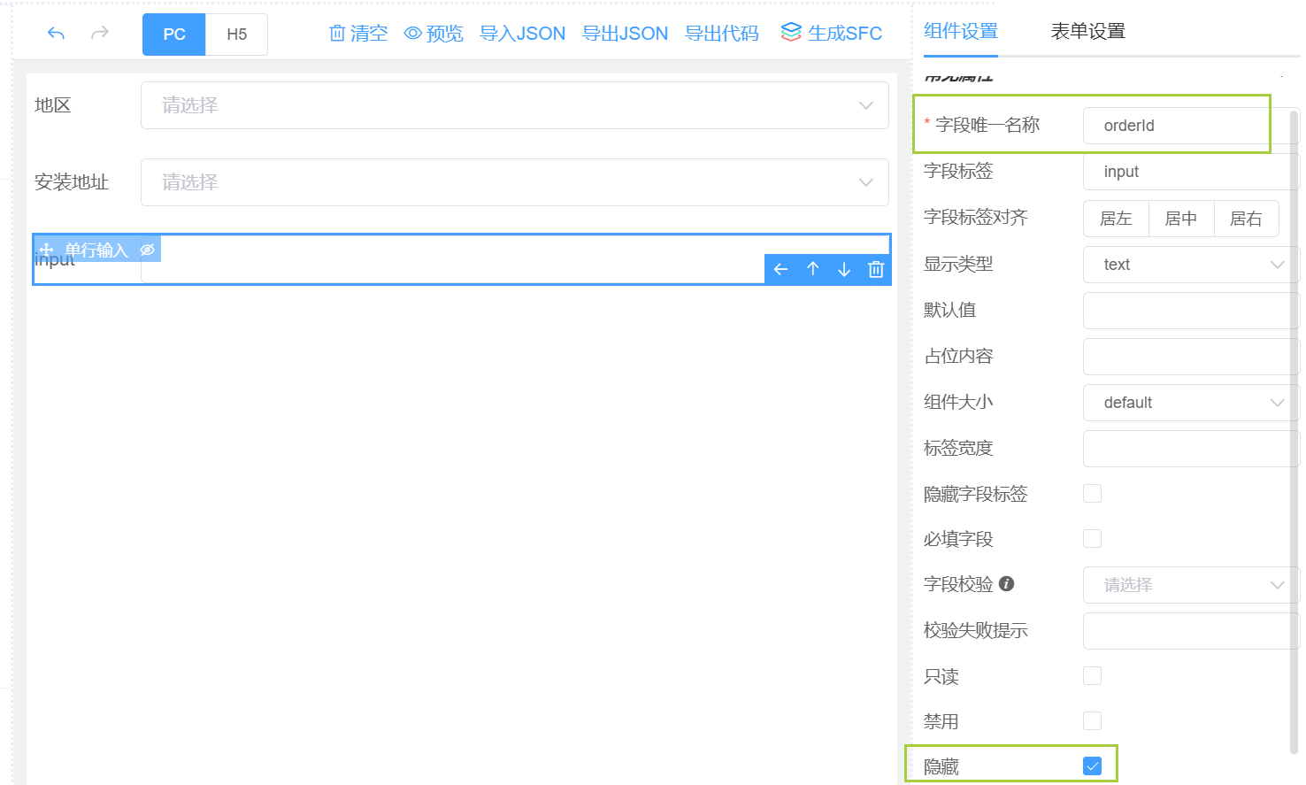 | form-json | 表单对象JSON 注意:如表单Json是从后端接口异步获取到的,请使用下述的API方法——setFormJson()赋值,使用form-json属性传值则会导致表单校验异常或表单渲染不成功。 | 无默认值 |