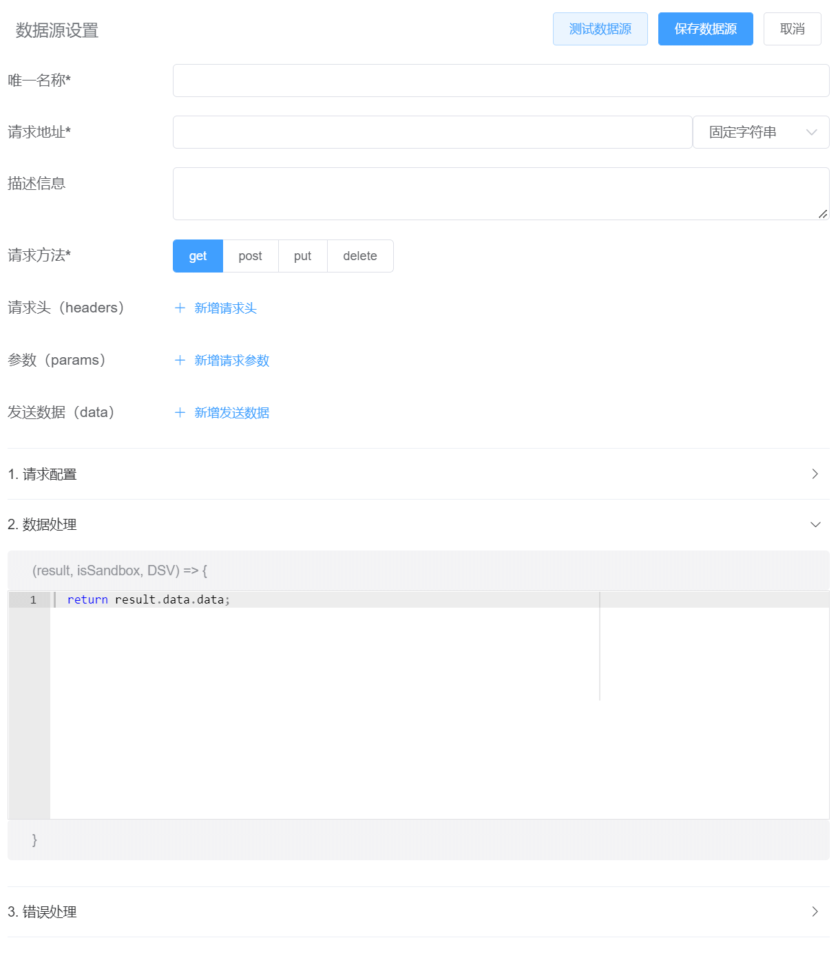 | global-dsv | 全局数据源变量(Pro版支持)dsv即Datasource Variables(数据源变量)缩写。 | 默认值为{},数据格式为:{ "myTestURL": "xxx", "token": "aabbcc", "countLimit": 600 //可以自由添加键值对}在数据源中可使用DSV["myTestURL"]、DSV["token"]、DSV["countLimit"]获取上述变量值。 |