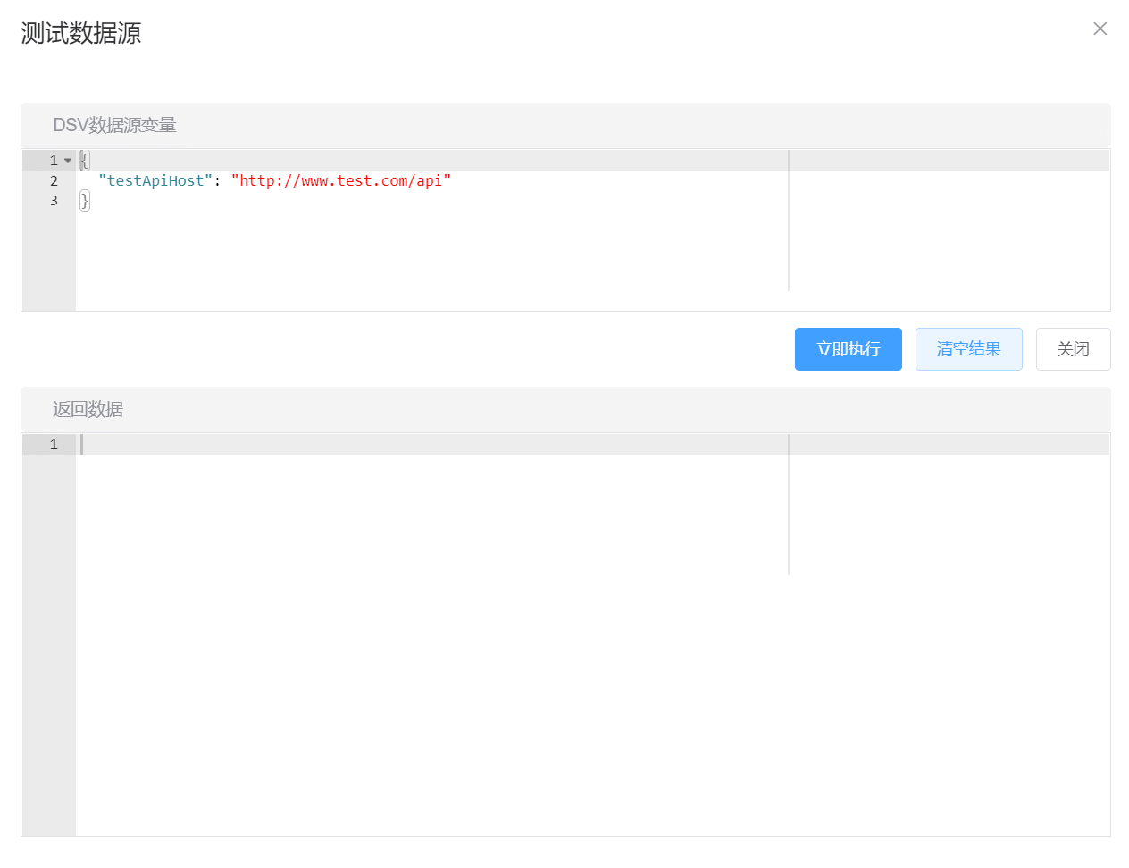 | global-dsv | 全局数据源变量(Pro版支持) dsv即Datasource Variables(数据源变量)缩写。 | 默认值为{},数据格式为: { "myTestURL": "xxx", "token": "aabbcc", "countLimit": 600 } 在数据源中可使用 DSV["myTestURL"]、 DSV["token"]、 DSV["countLimit"] 获取上述变量值。 |