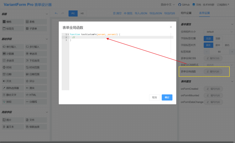 | exportJson | 打开--导出表单JSON--弹窗 | — |