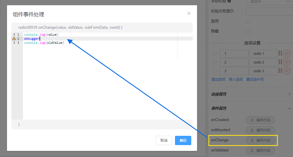 | onFormDataChange | 表单数据改变后触发 | (fieldName, newValue, oldValue): fieldName,触发本事件的字段名 newValue,字段新值 oldValue,字段旧值 |
