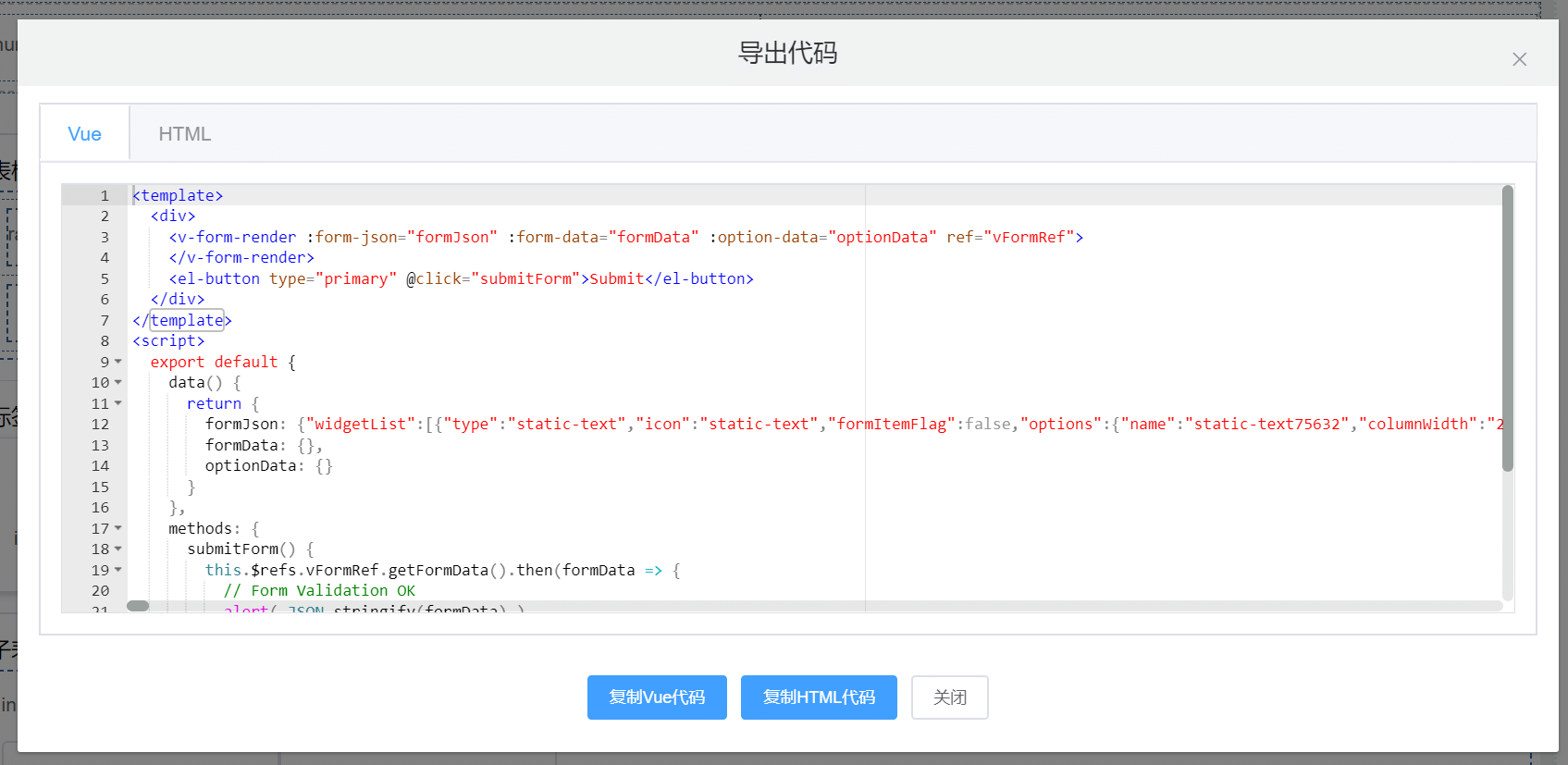 | exportCode | 打开--导出Vue/HTML代码--弹窗 | — |