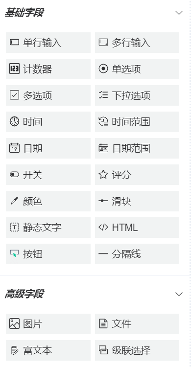 | banned-widgets | 配置禁止设计器显示的组件 | 默认为[],数据格式为组件type名称的数组,比如:['table', 'rate', 'switch'] |