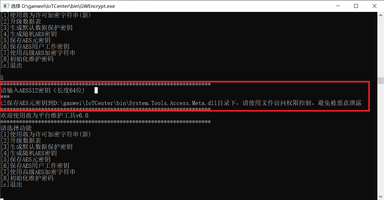 按提示,输入一个 AES512 的密钥,该密钥长度为 64 位。输入完成后,工具自动保存元密钥到本地目录下。