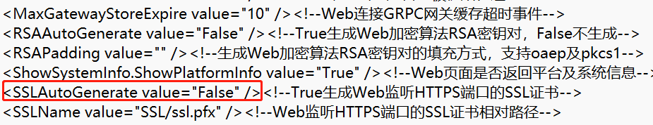 <EnableSSLGen value="false" /><!--GRPC服务HTTPS端口配置时,true自动生成SSL证书,false不生成证书-->