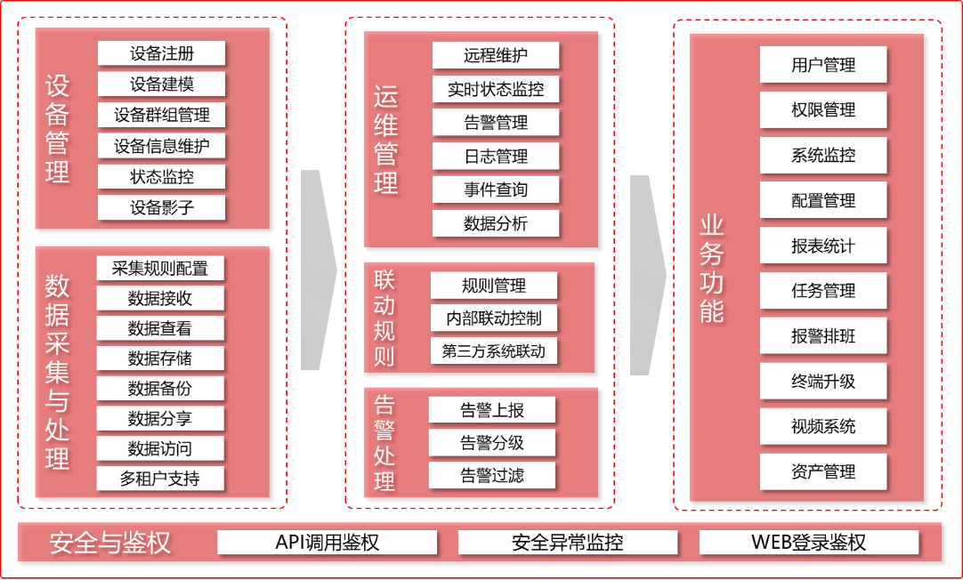 平台功能主要分为设备管理、数据采集与处理、运维管理、联动规则、告警处理、可扩展的业务功能,并提供强大的安全与鉴权机制。