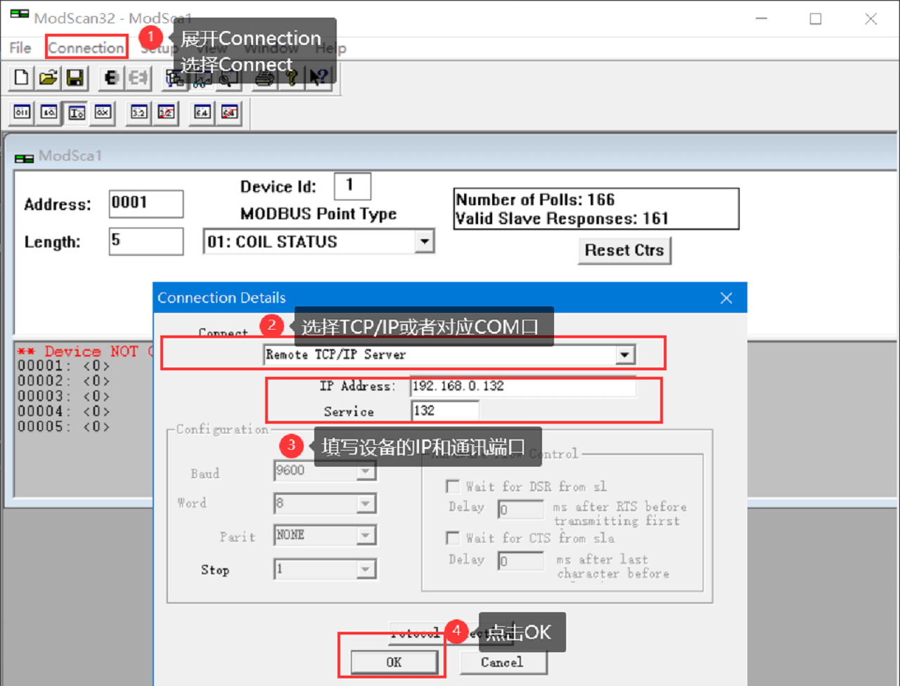 展开 Connection 选择 Connect,选择对接方式:TCP/IP 或者 COM 口,下图以 TCP/IP 对接方式示例,填写对应的设备 IP 和端口号。