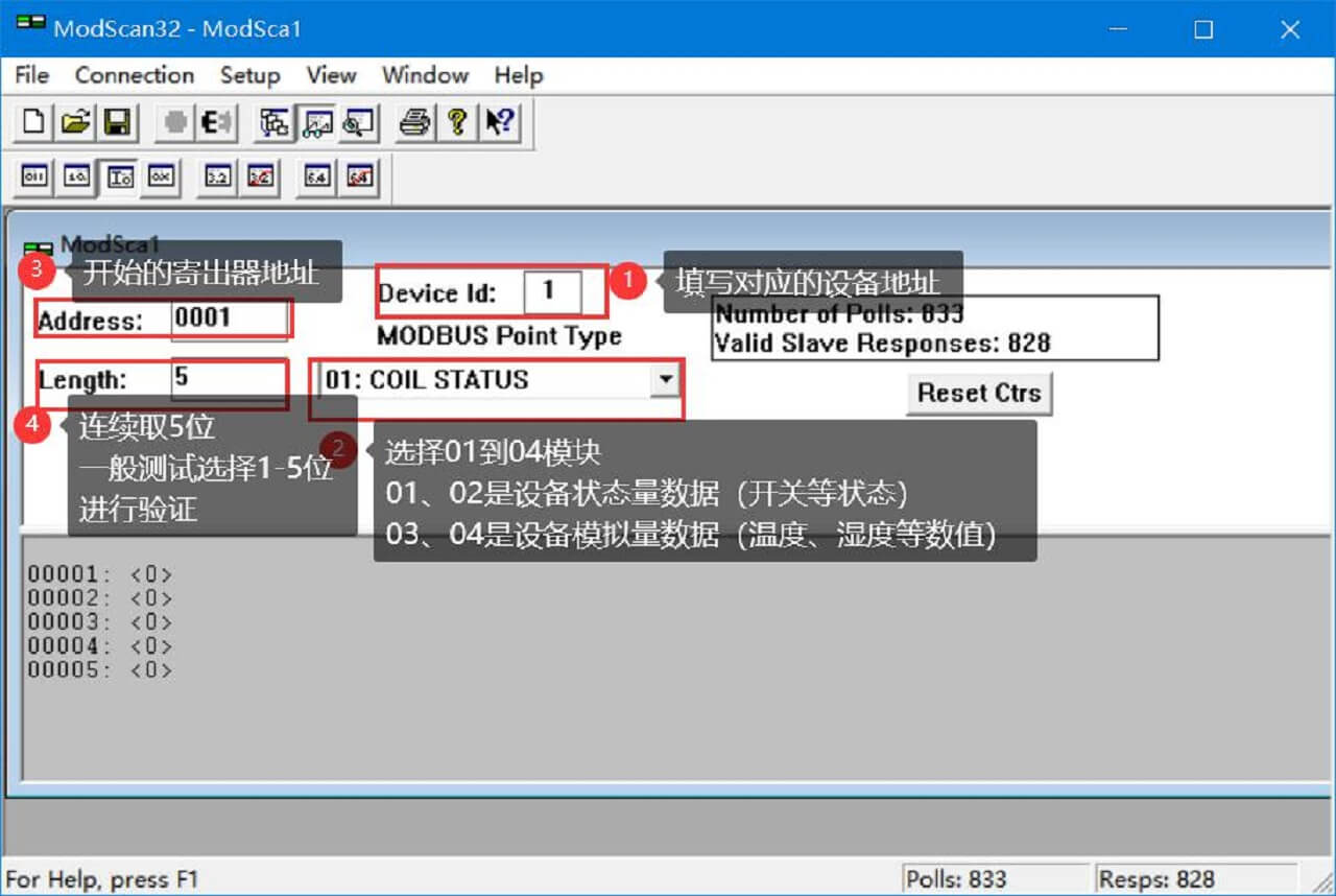 先填写对应的设备地址,再选择 01 到 04 的模块功能码(01、02 是设备状态量数据,03、04 是设备模拟量数据),最后选择开始的寄存器地址,设定连续取值的位数。