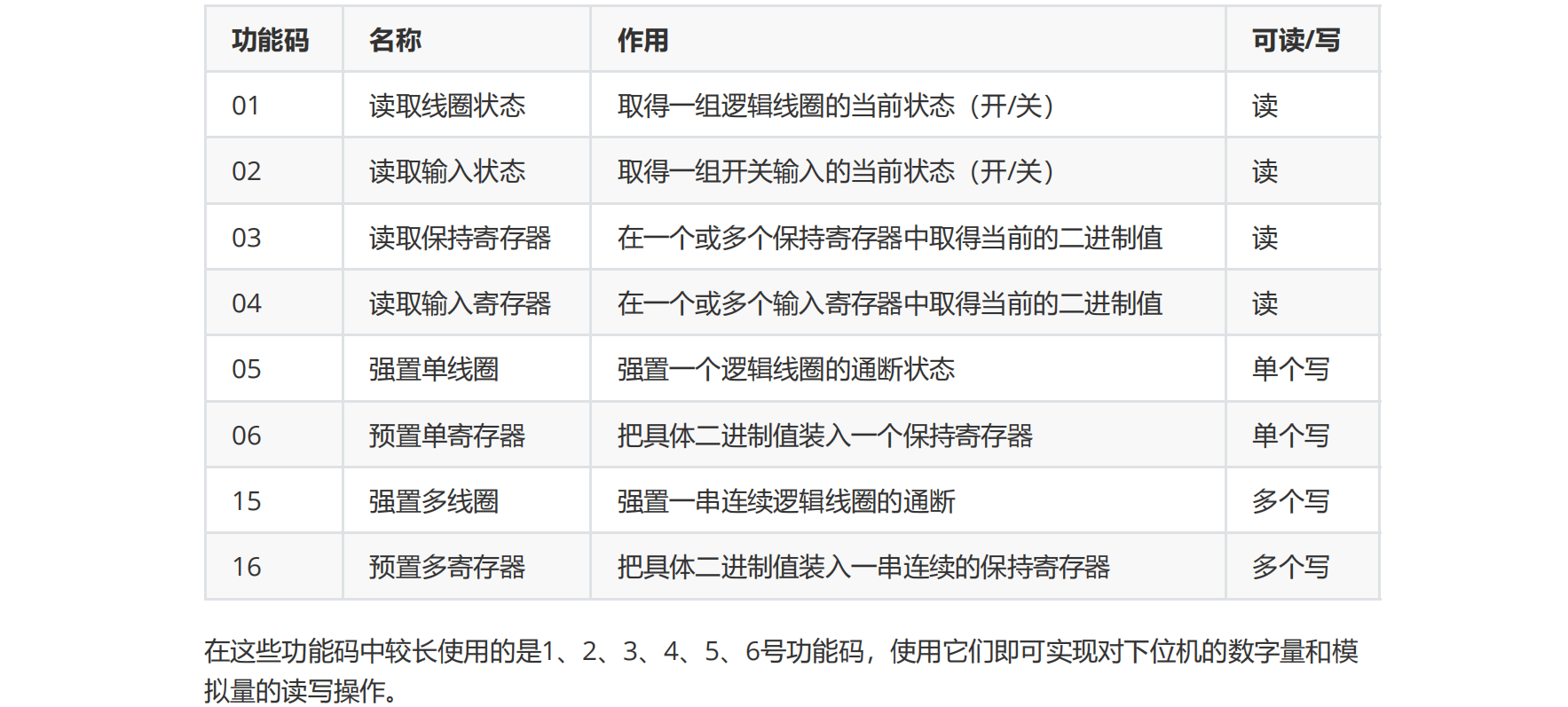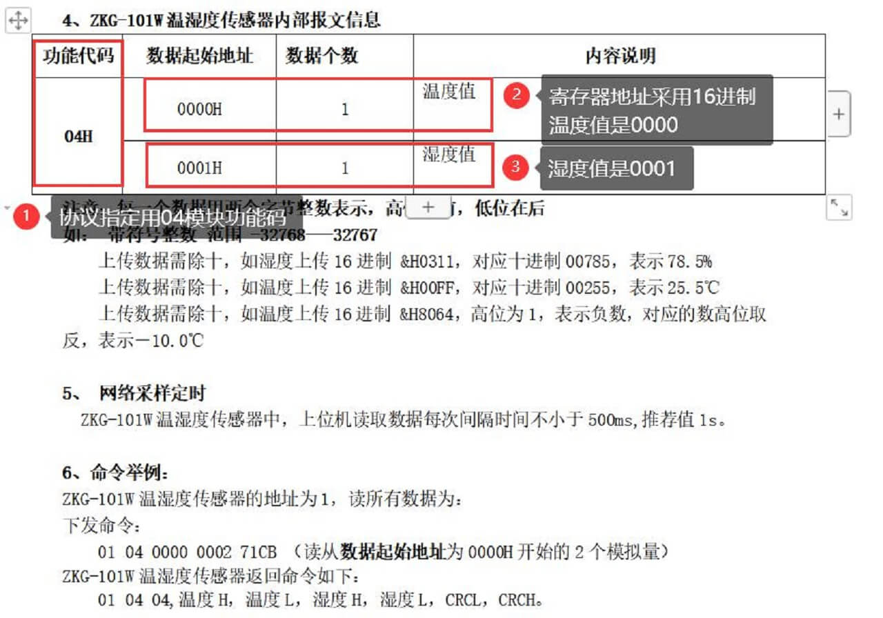 Modbus 协议点表中会明确定义设备各参数的对应模块功能码和寄存器地址位,下面以温湿度的协议举例: