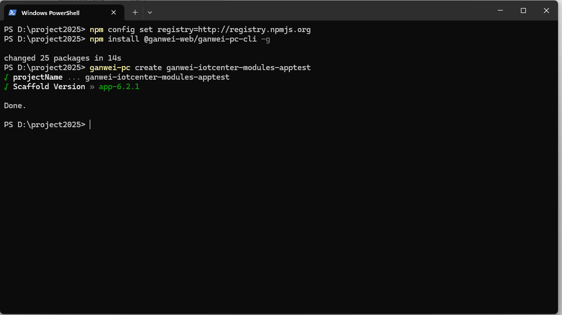 - 执行脚本 ganwei-pc create [projectName] , 将 projectName 替换为自己项目的名字
