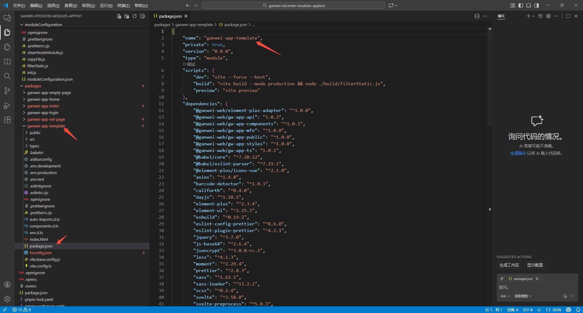 1. 修改子模块下 package.json,main.js 中的模块名称