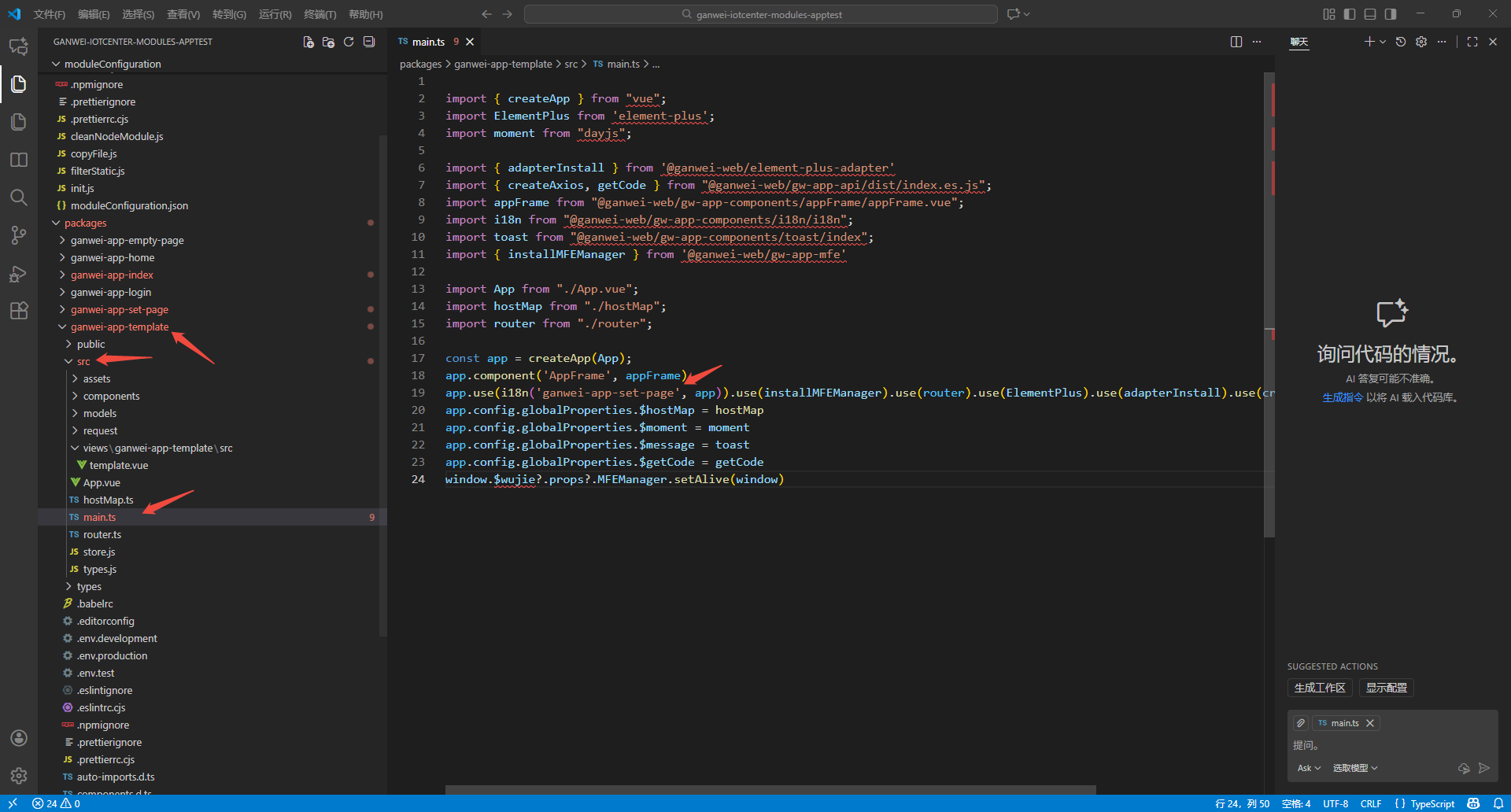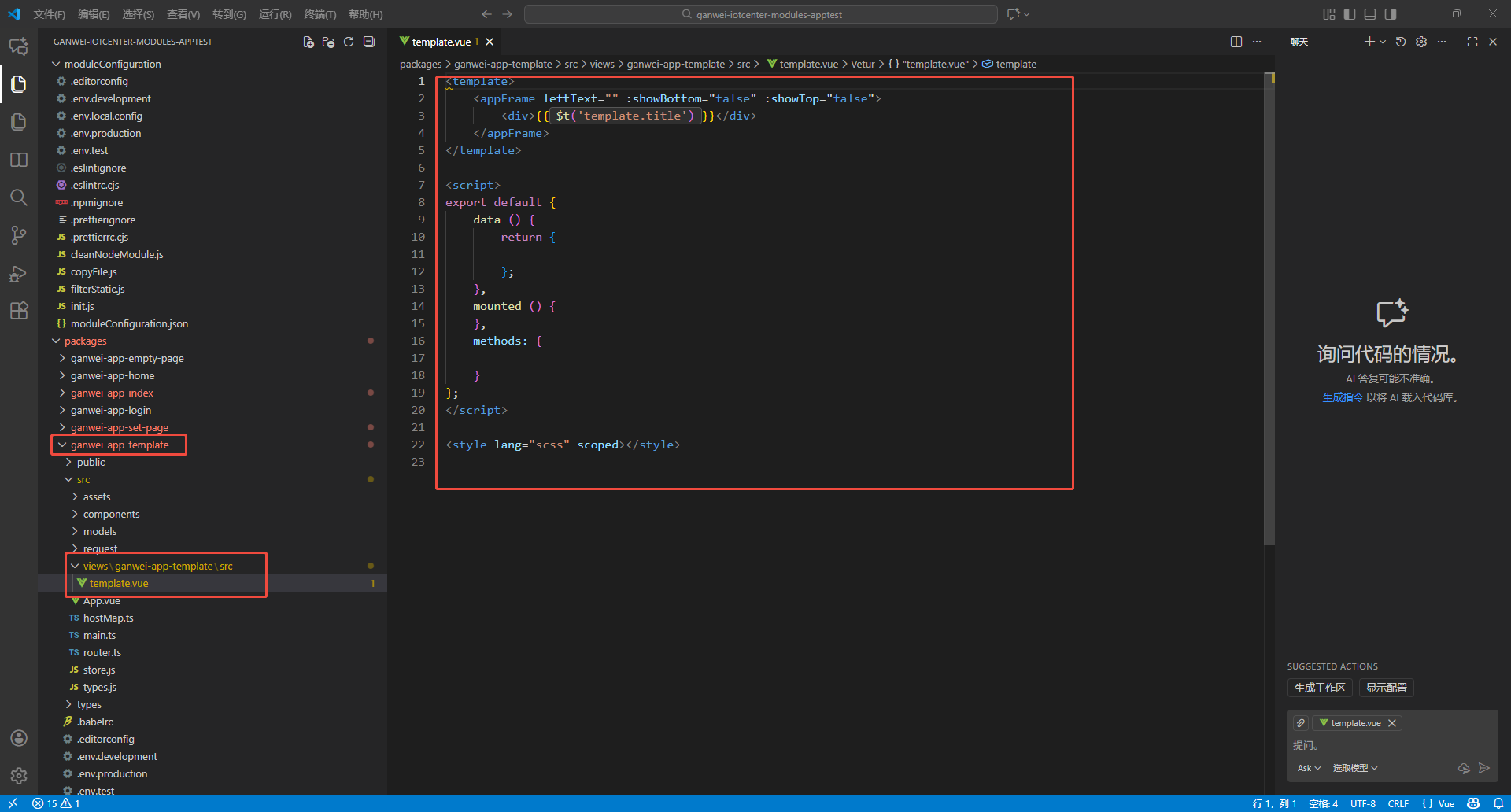 在packages 目录下面找到子应用模板,打开 src/views 目录,根据子应用功能,创建 vue 文件。