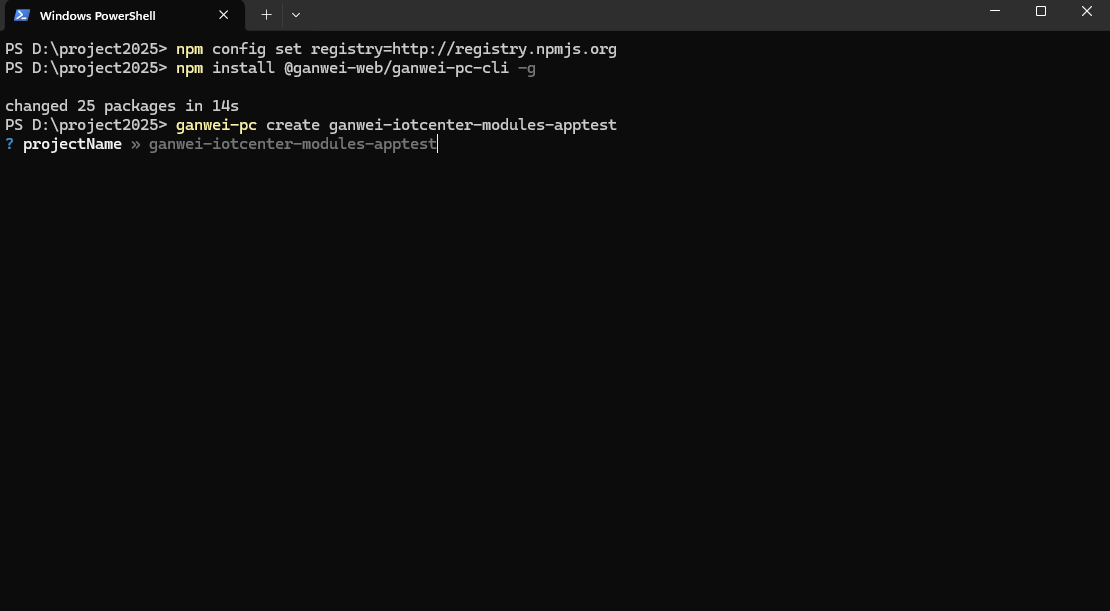 - 执行脚本 ganwei-pc create [projectName] , 将 projectName 替换为自己项目的名字