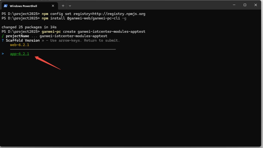 - 执行指令,该指令只生成单独项目,如需完整项目请看ganwei-app demo相关内容