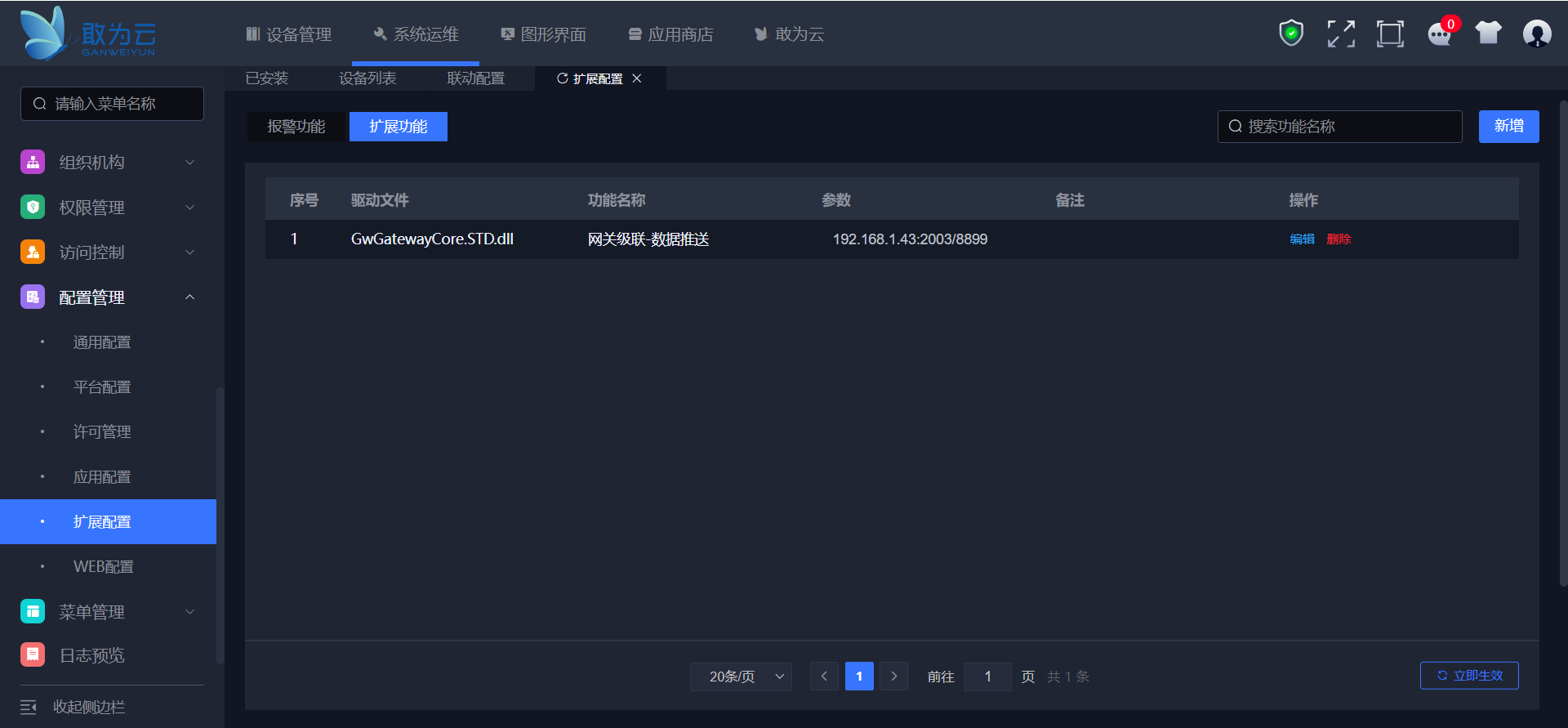 点击左侧菜单栏配置管理->扩展配置->扩展功能,点击新增