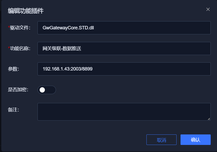 填入驱动、名称和参数(192.168.110.99:2003/8899的含义为:A平台的网关通过8899端口向192.168.110.99平台也就是平台B的2003端口推送数据)