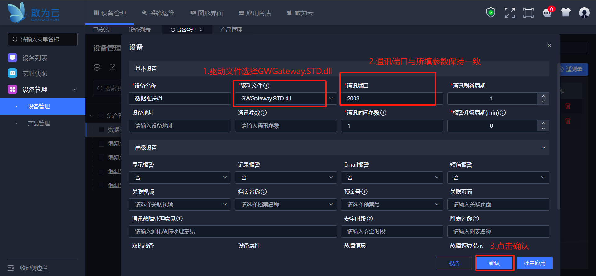 在平台B中添加设备,驱动选择GwGateway.STD.dll,通讯端口配置为2003,与A平台扩展插件中配置的推送端口保持一致。