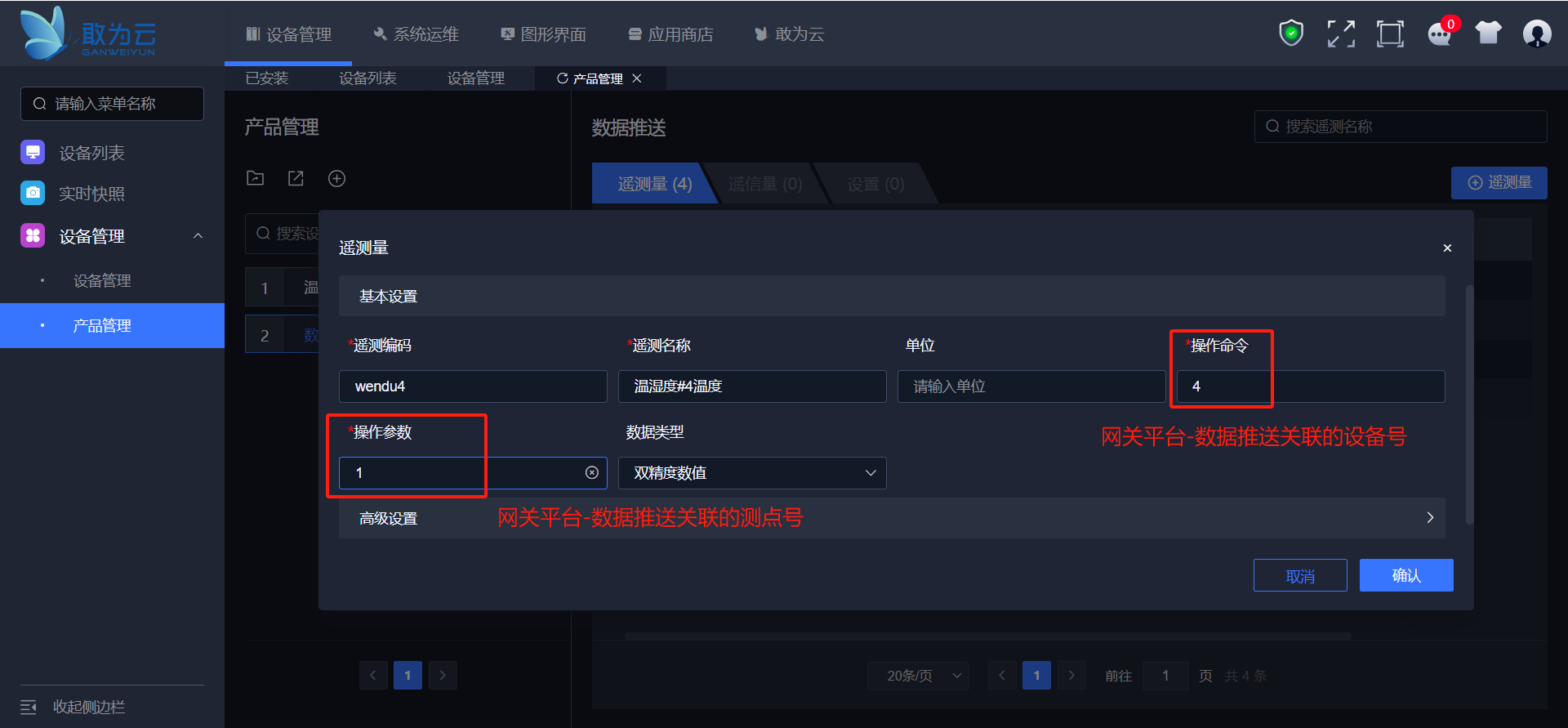 - 为上一步骤中添加的设备添加测点,以遥测为例,在操作命令中配置A平台设备的设备号,操作参数中配置A平台设备的测点号,依次类推将A平台的3个温湿度设备全部配置为新设备的测点。