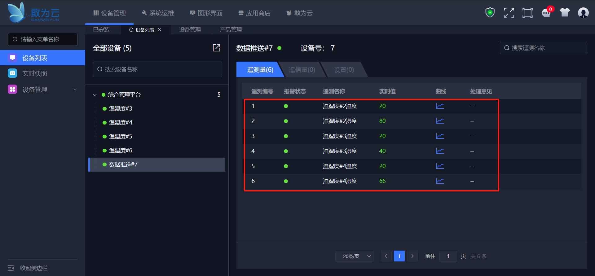 在两个平台中,进行7个温湿度设备的正常配置,完成设备的接入。