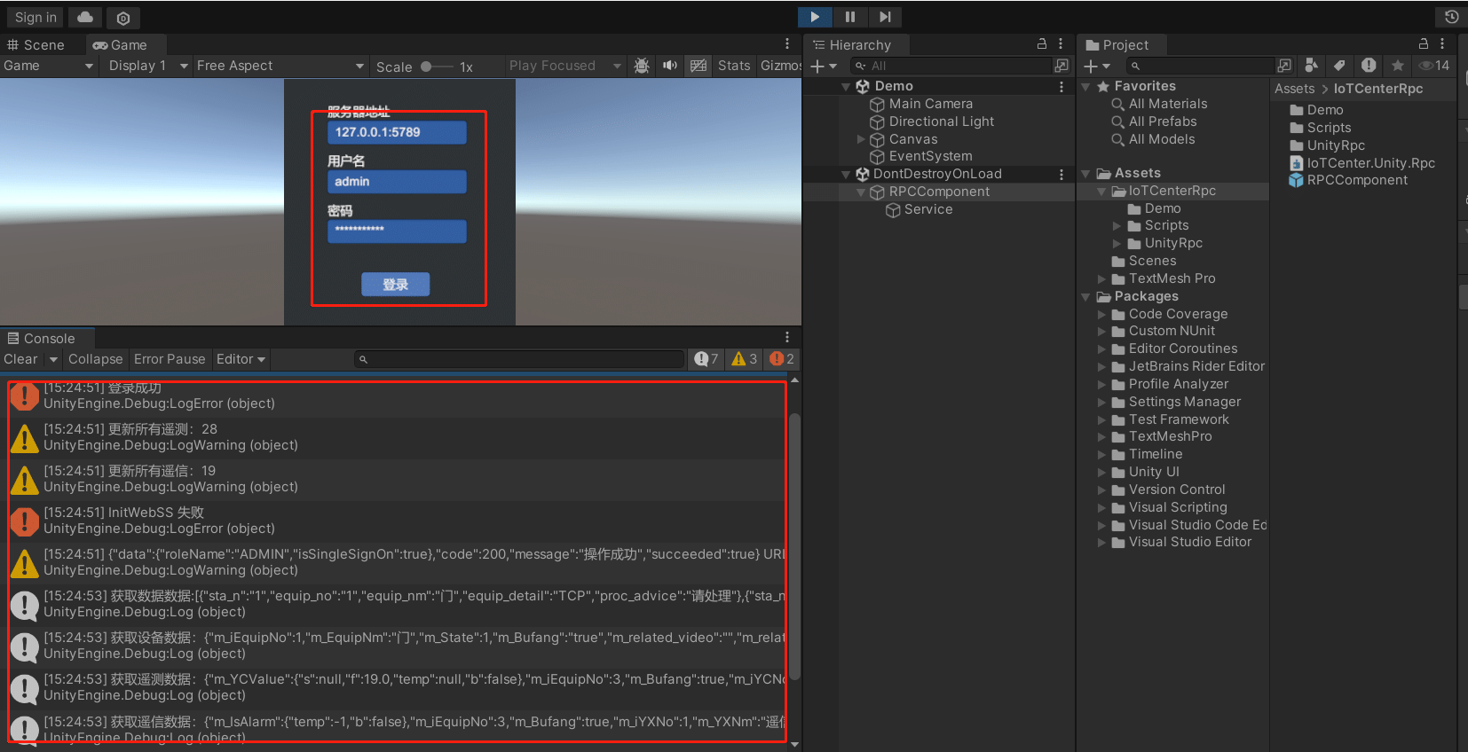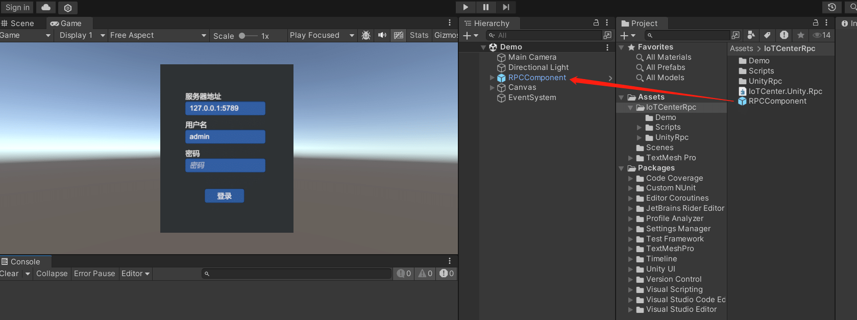 1.导入插件到你的Unity 项目之后。将 IoTCenterRpc 目录下的 “RPCComponent”预制体拖入你的场景中即可。