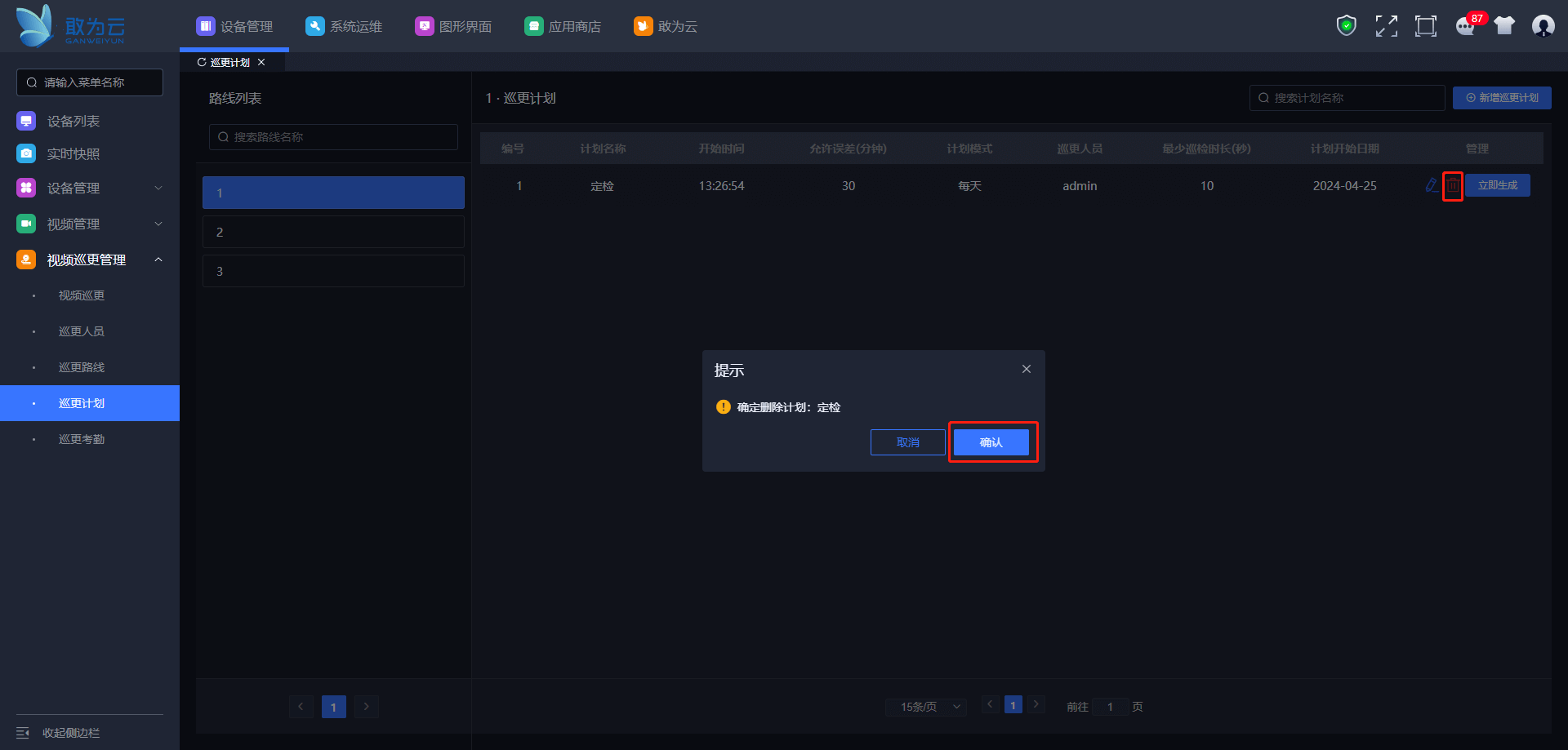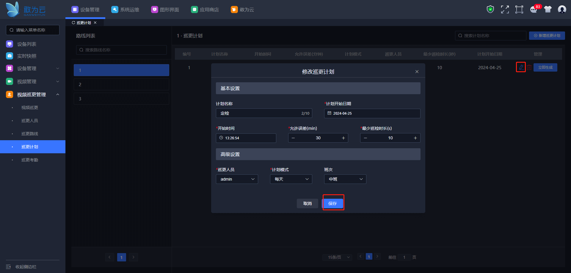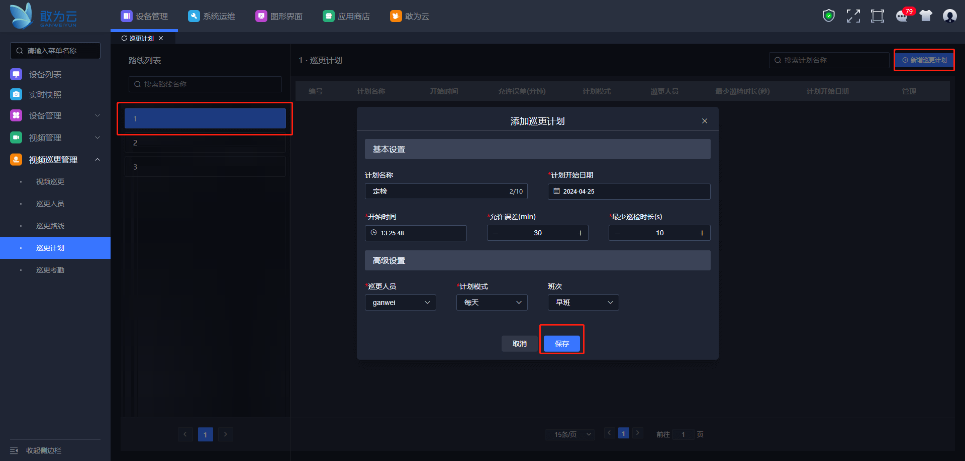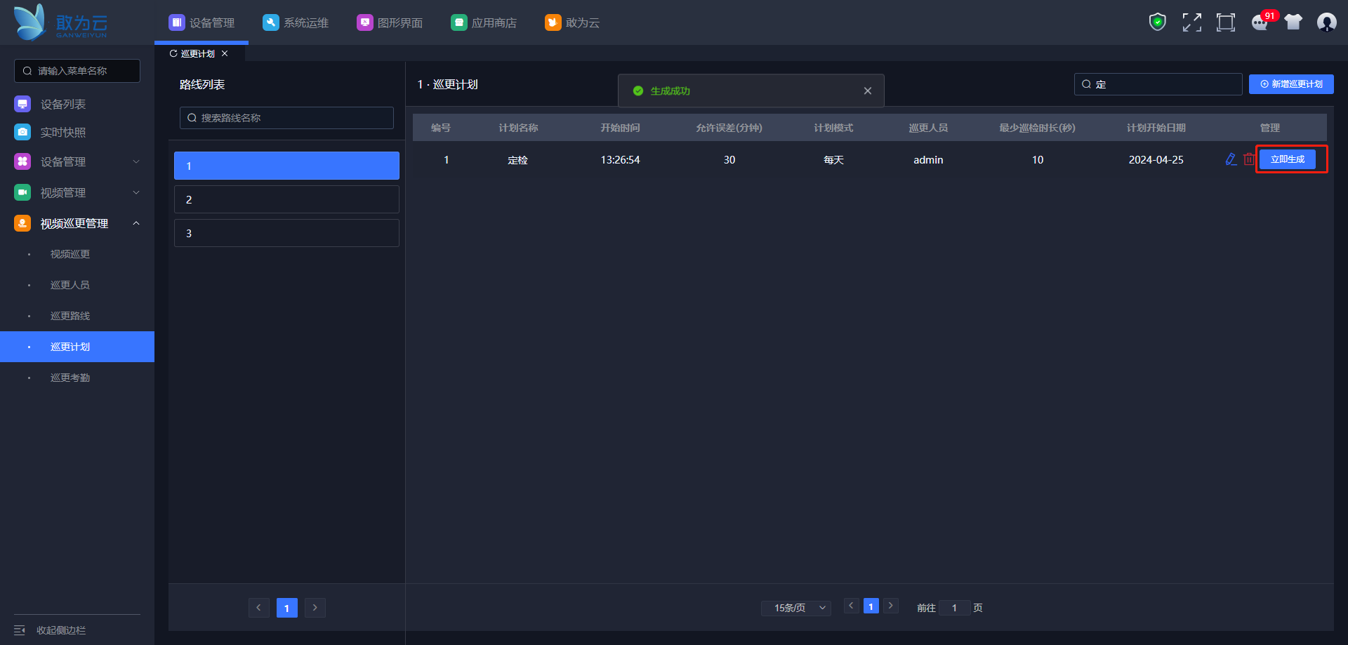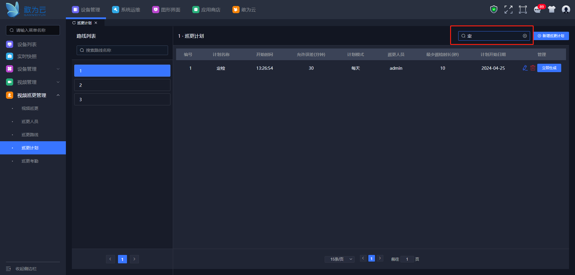 | 5 | 支持管理巡更计划。 | 支持新增巡更计划。 支持修改巡更计划。 支持删除巡更计划。 支持查询巡更计划。 支持立即生成巡更计划。 |