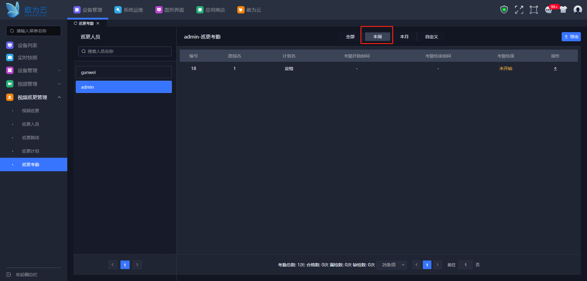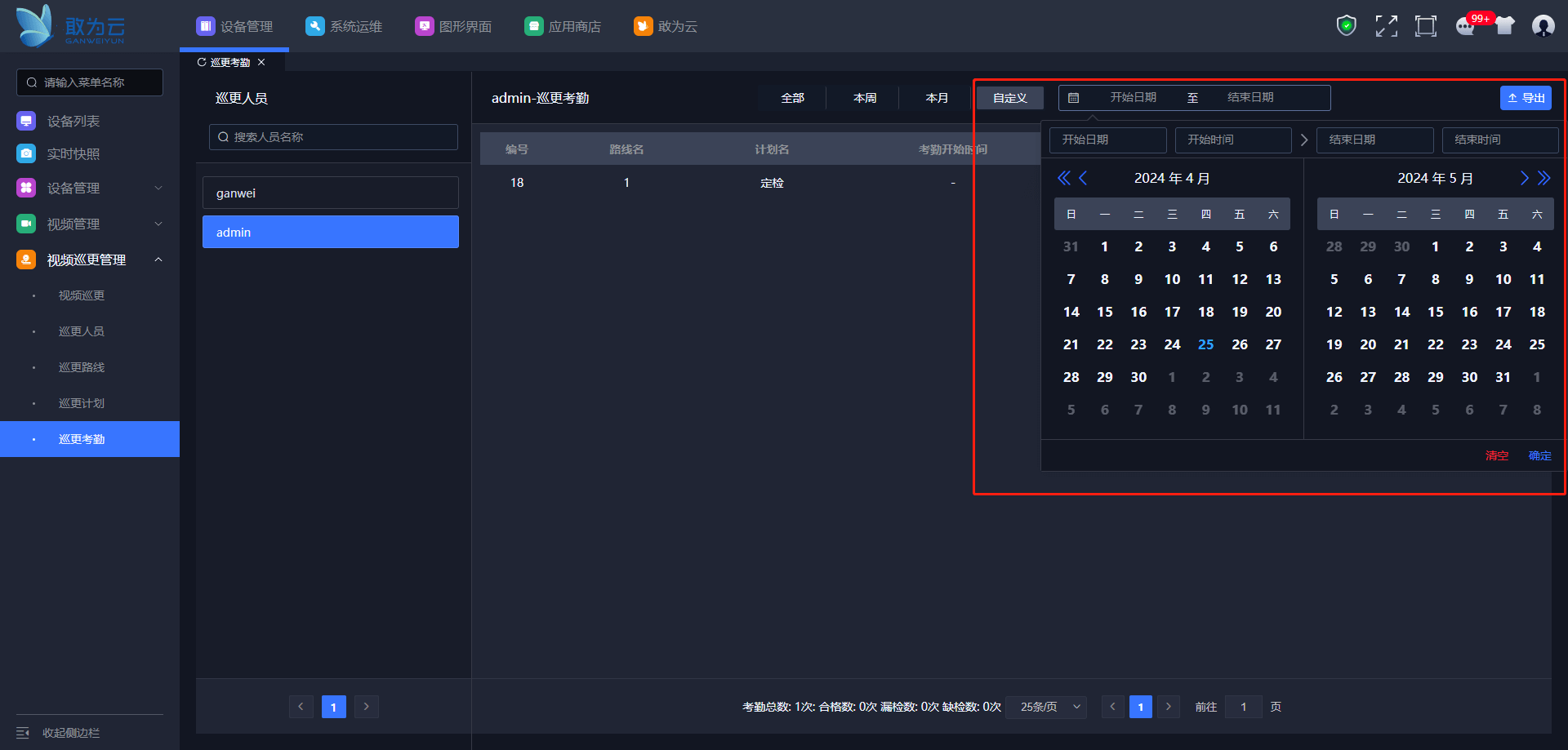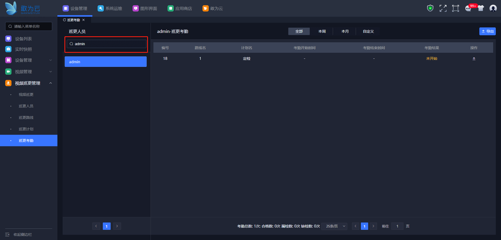 | 6 | 支持管理巡更考勤。 | 支持查询巡更人员。 支持查询巡更考勤(全部、按周、按月及自定义)。 支持查看考勤详情。 支持导出考勤。 支持导出全部考勤。 |