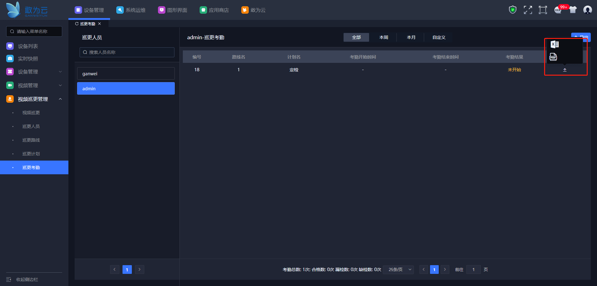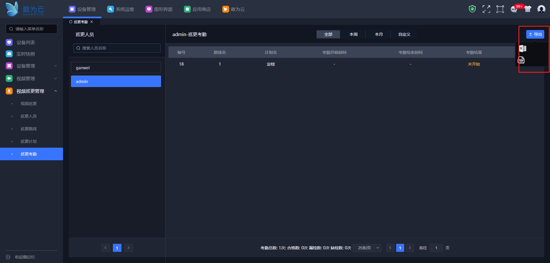 在视频巡更考勤计划生成之后,会对应生成一条巡更考勤记录。我们可以在巡更考勤界面查看并且导出巡更考勤的相关信息和详细信息,支持xls和pdf两种格式的导出。