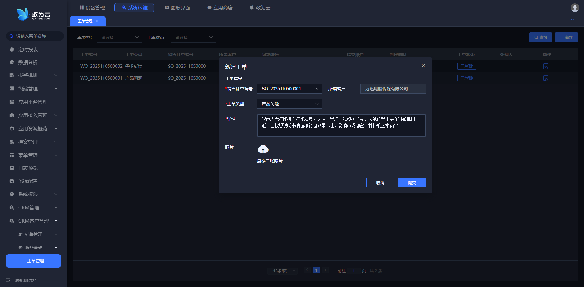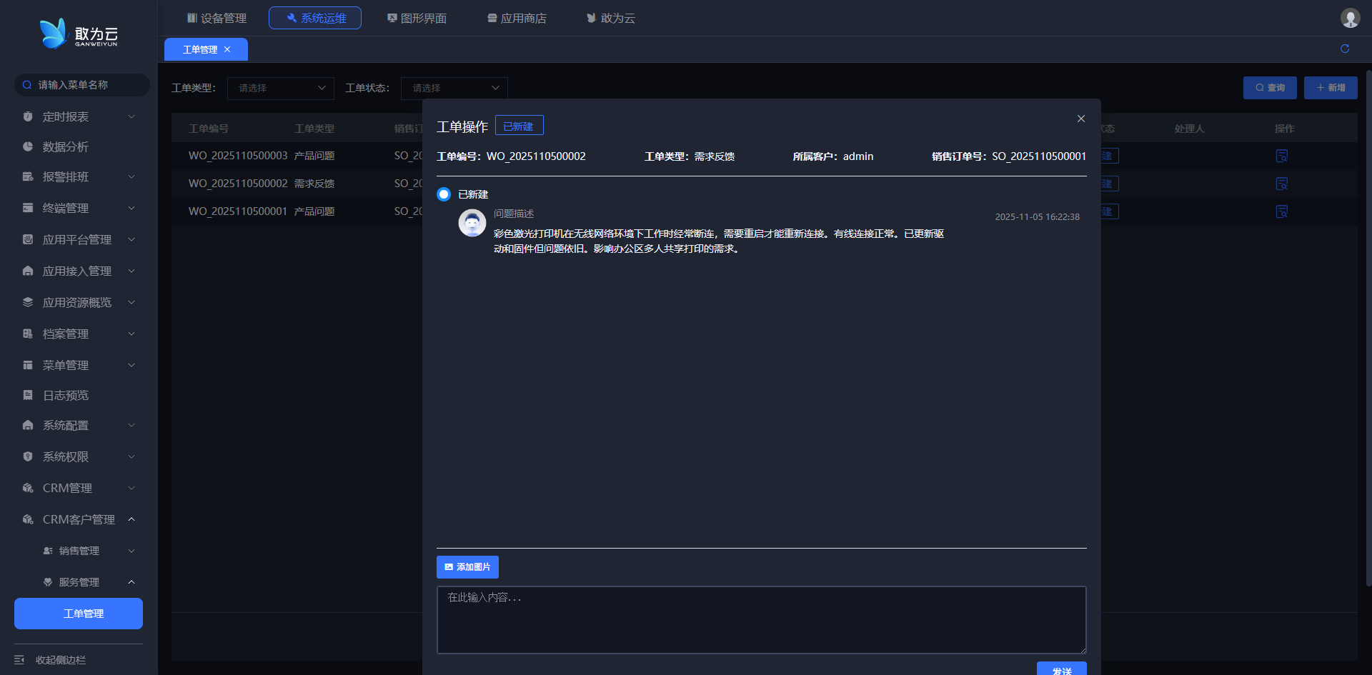 工单管理功能用于创建、分配、跟踪和处理客户服务请求,确保客户问题得到及时响应与解决,提升售后服务质量与客户满意度。
