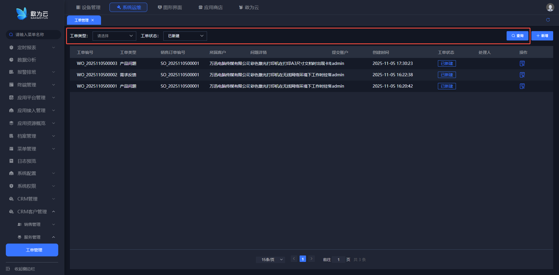 - 在 「工单管理」 列表页顶部,使用提供的筛选条件进行查询;
