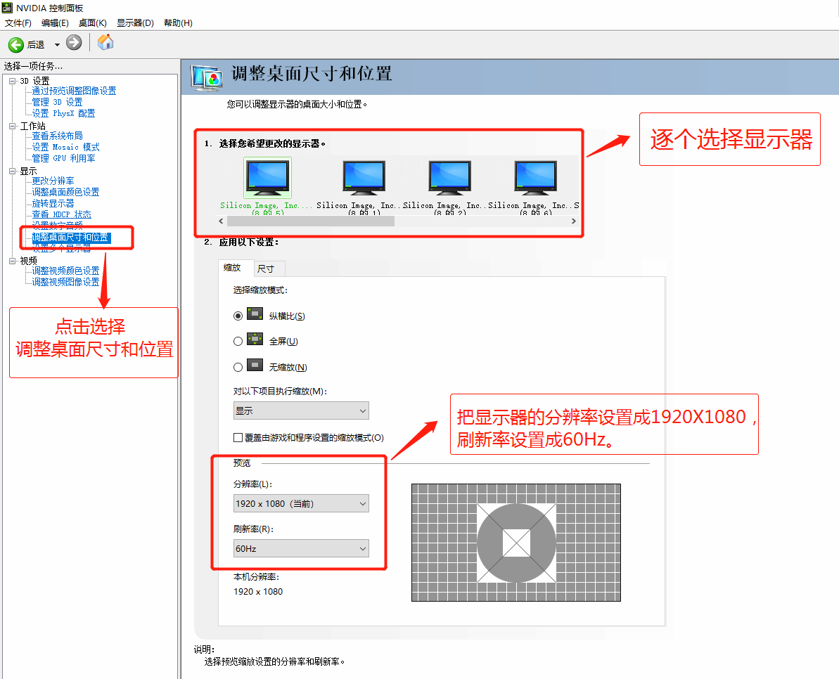 - 右键桌面,在弹出的菜单点击打开显卡控制面板,在*"*调整桌面尺寸和位置"设置好每一个显示器的分辨率为"1920X1080"、刷新率为"60Hz"。